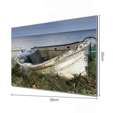 Material: 4mm Sicherheitsglas mit Metallrückwand Eigenschaften: beschreibbar, magnetisch, kratzfest Maße: 90x60x0,6cm, 8,10kg schwer Motiv Nummer 12085 Vergessenes Fischerboot Zubehör: inklusive 4 Neodym-Magnete