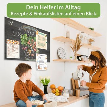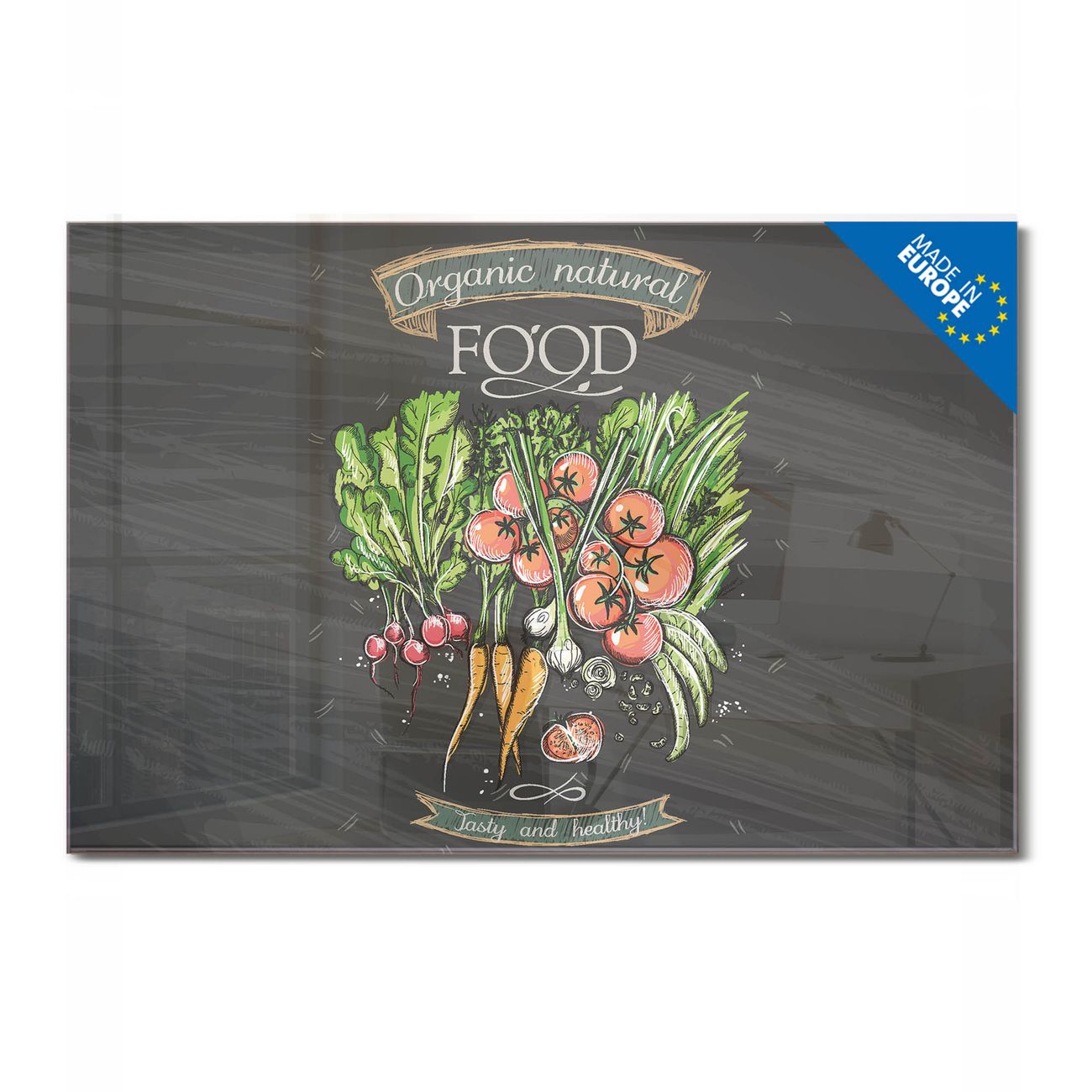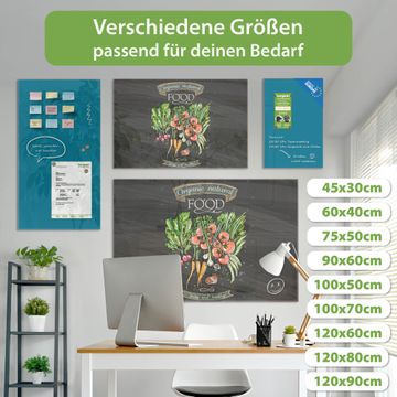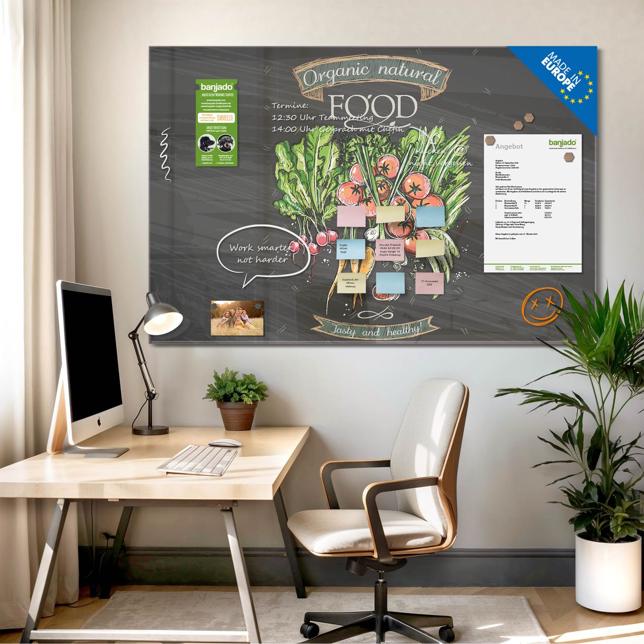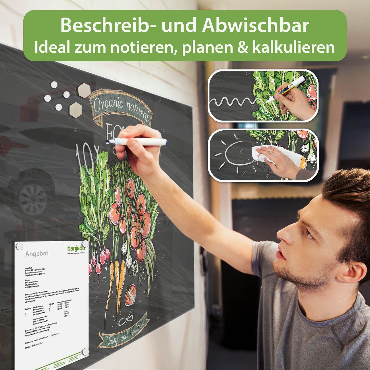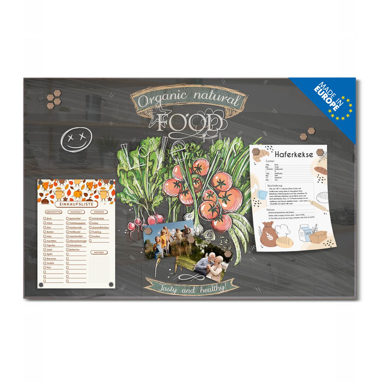 Material: 4mm Sicherheitsglas mit Metallrückwand Eigenschaften: beschreibbar, magnetisch, kratzfest Maße: 75x50x0,6cm, 5,63kg schwer Motiv Nummer 10983 Gesund Und Lecker Zubehör: inklusive 4 Neodym-Magnete