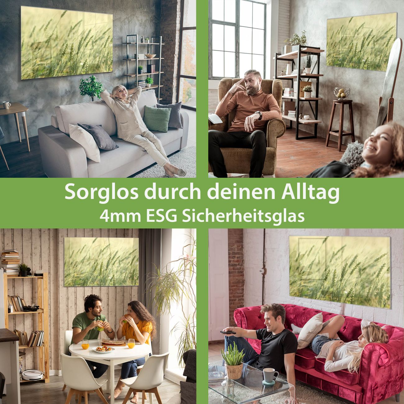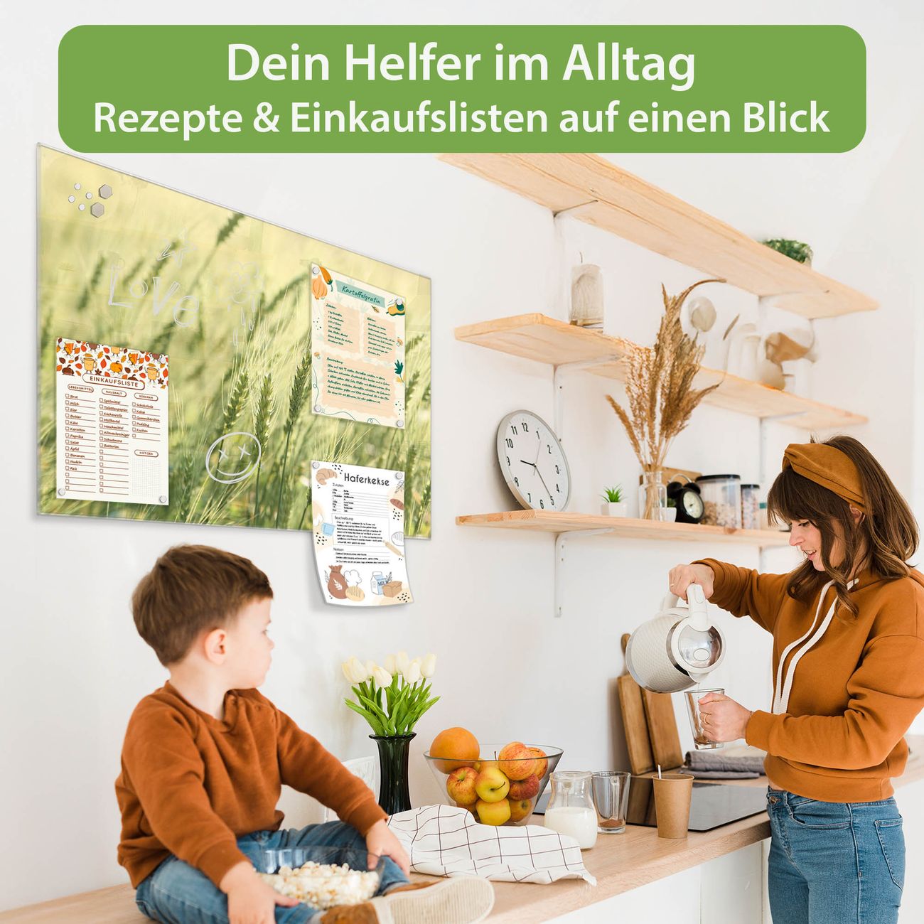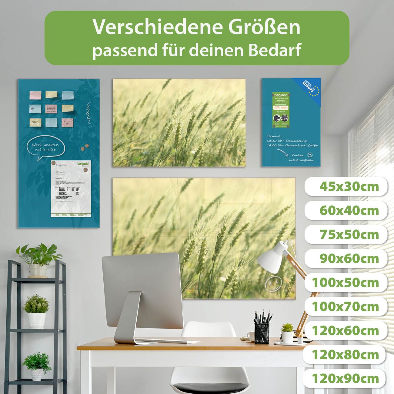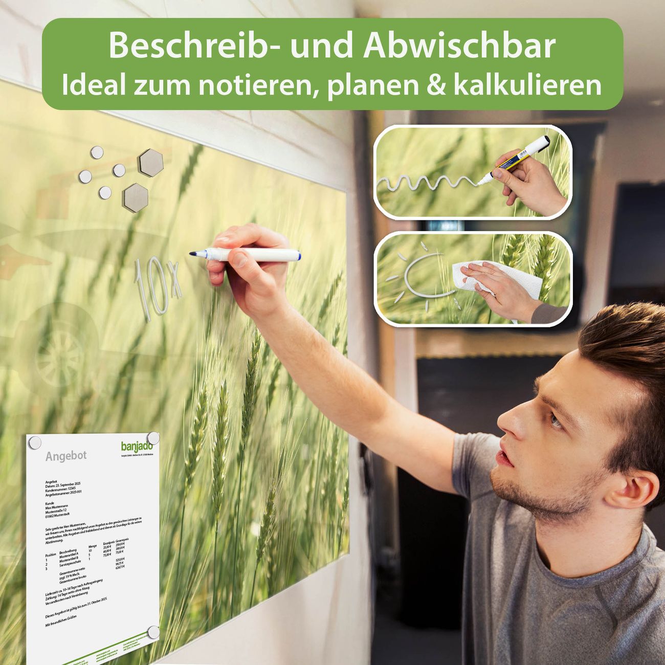 Material: 4mm Sicherheitsglas mit Metallrückwand Eigenschaften: beschreibbar, magnetisch, kratzfest Maße: 45x30x0,6cm, 2,03kg schwer Motiv Nummer 11376 Junges Getreide Zubehör: inklusive 4 Neodym-Magnete