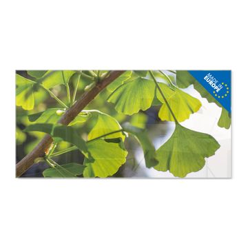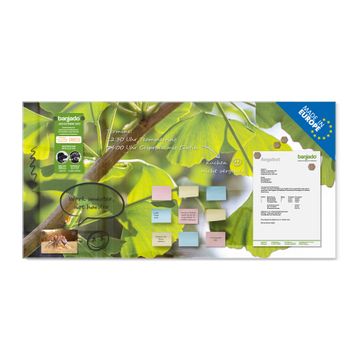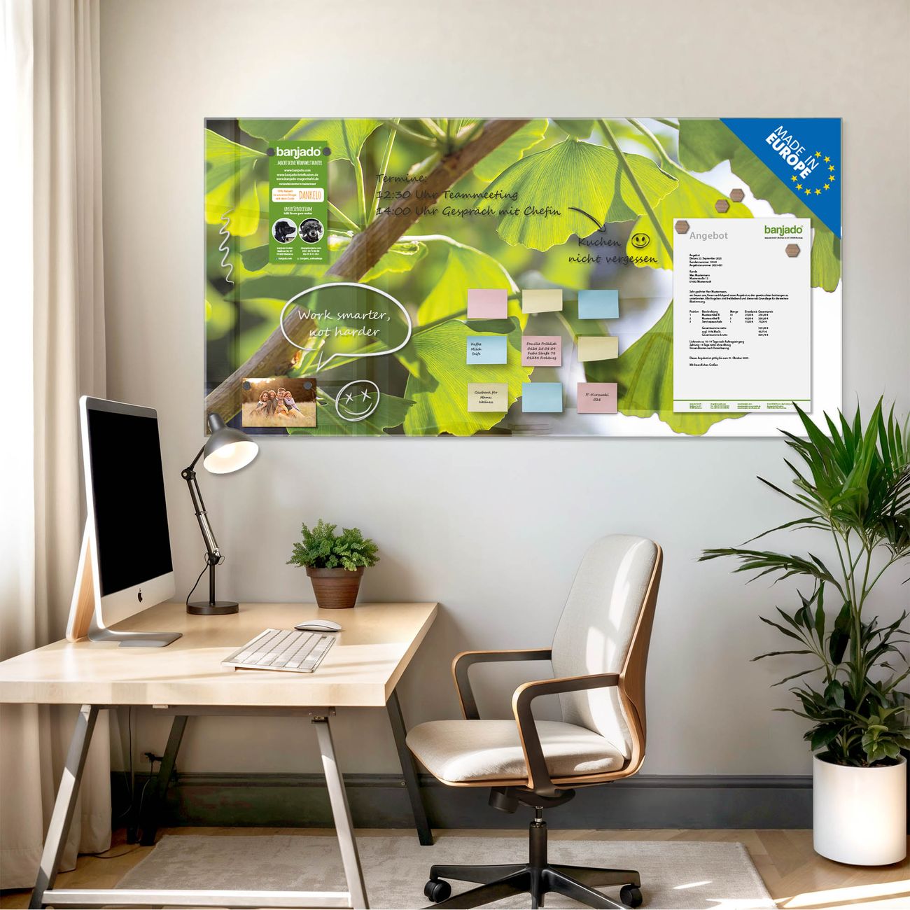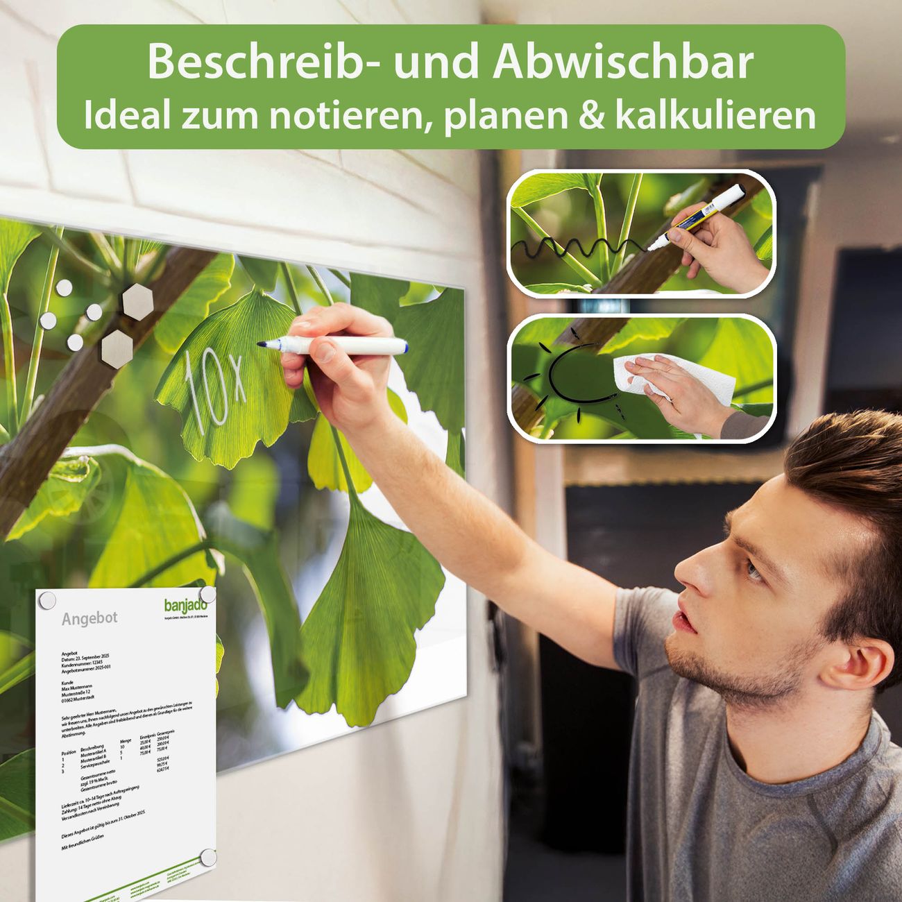 Material: 4mm Sicherheitsglas mit Metallrückwand Eigenschaften: beschreibbar, magnetisch, kratzfest Maße: 110x55x0,6cm, 9,08kg schwer Motiv Nummer 10537 Gingko Zubehör: inklusive 4 Neodym-Magnete