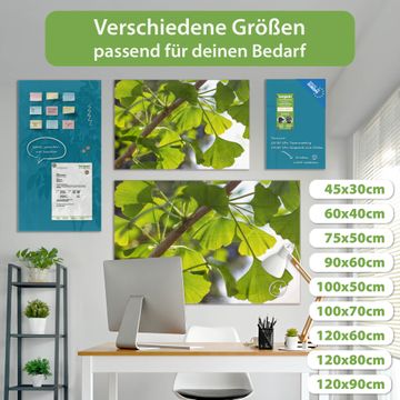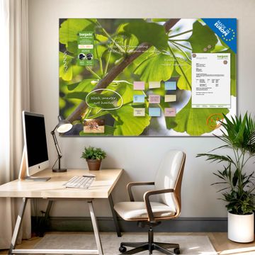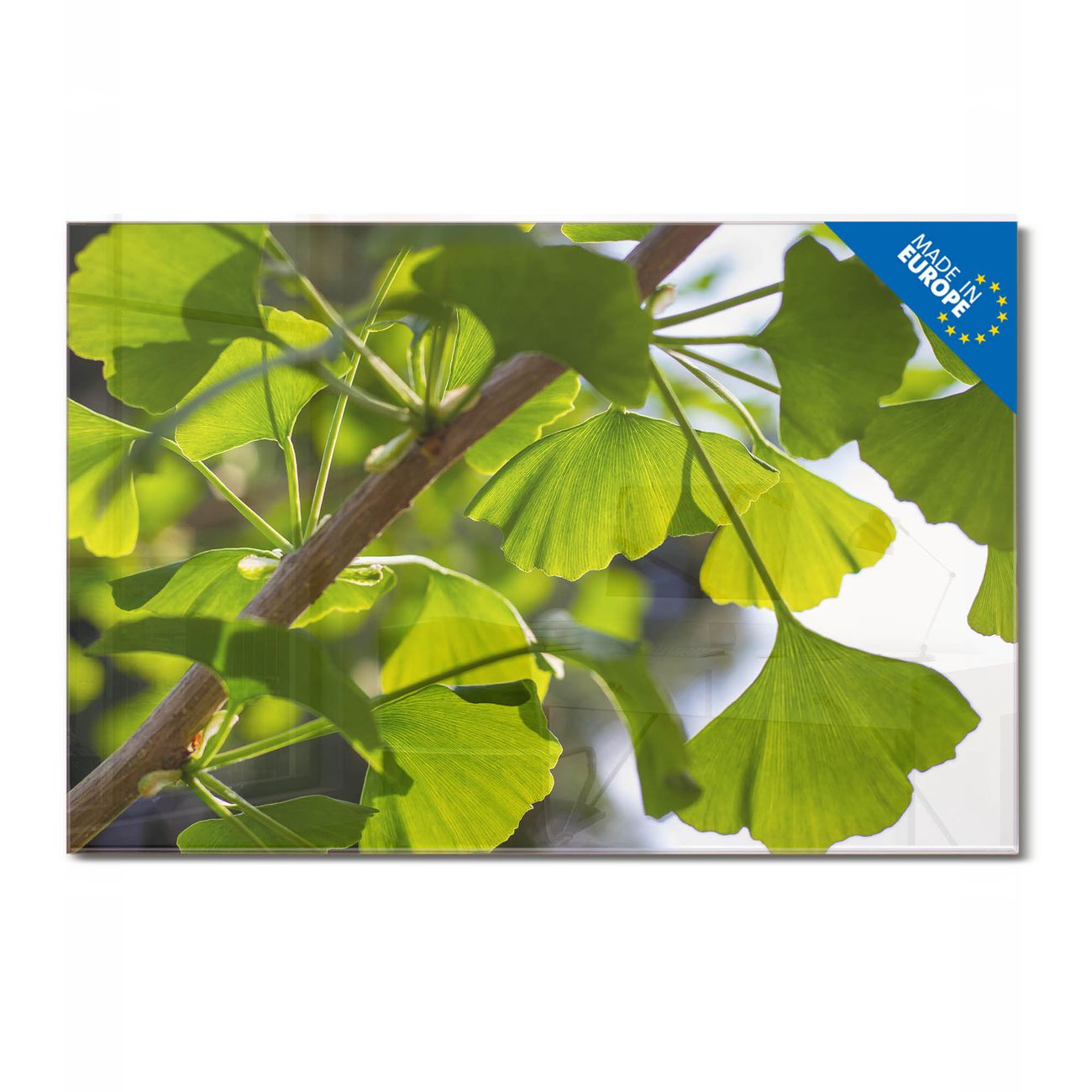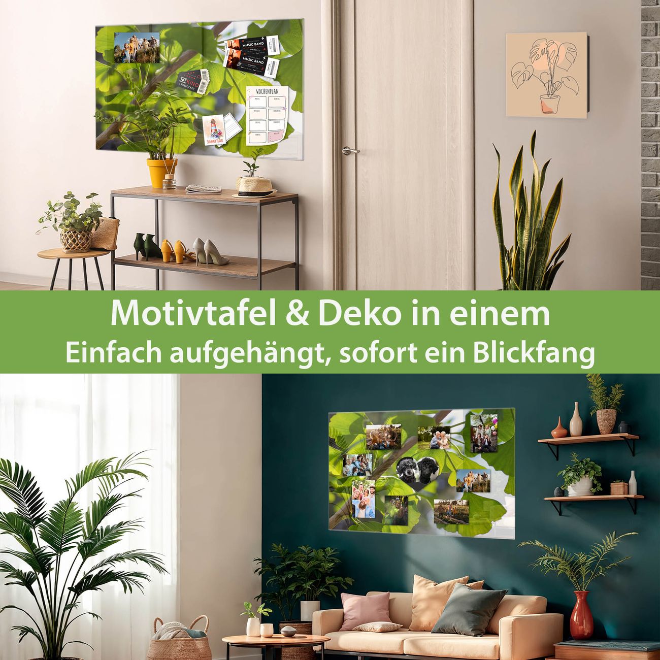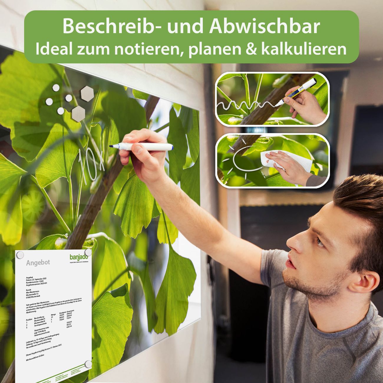 Material: 4mm Sicherheitsglas mit Metallrückwand Eigenschaften: beschreibbar, magnetisch, kratzfest Maße: 120x80x0,6cm, 14,40kg schwer Motiv Nummer 10537 Gingko Zubehör: inklusive 4 Neodym-Magnete