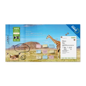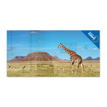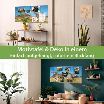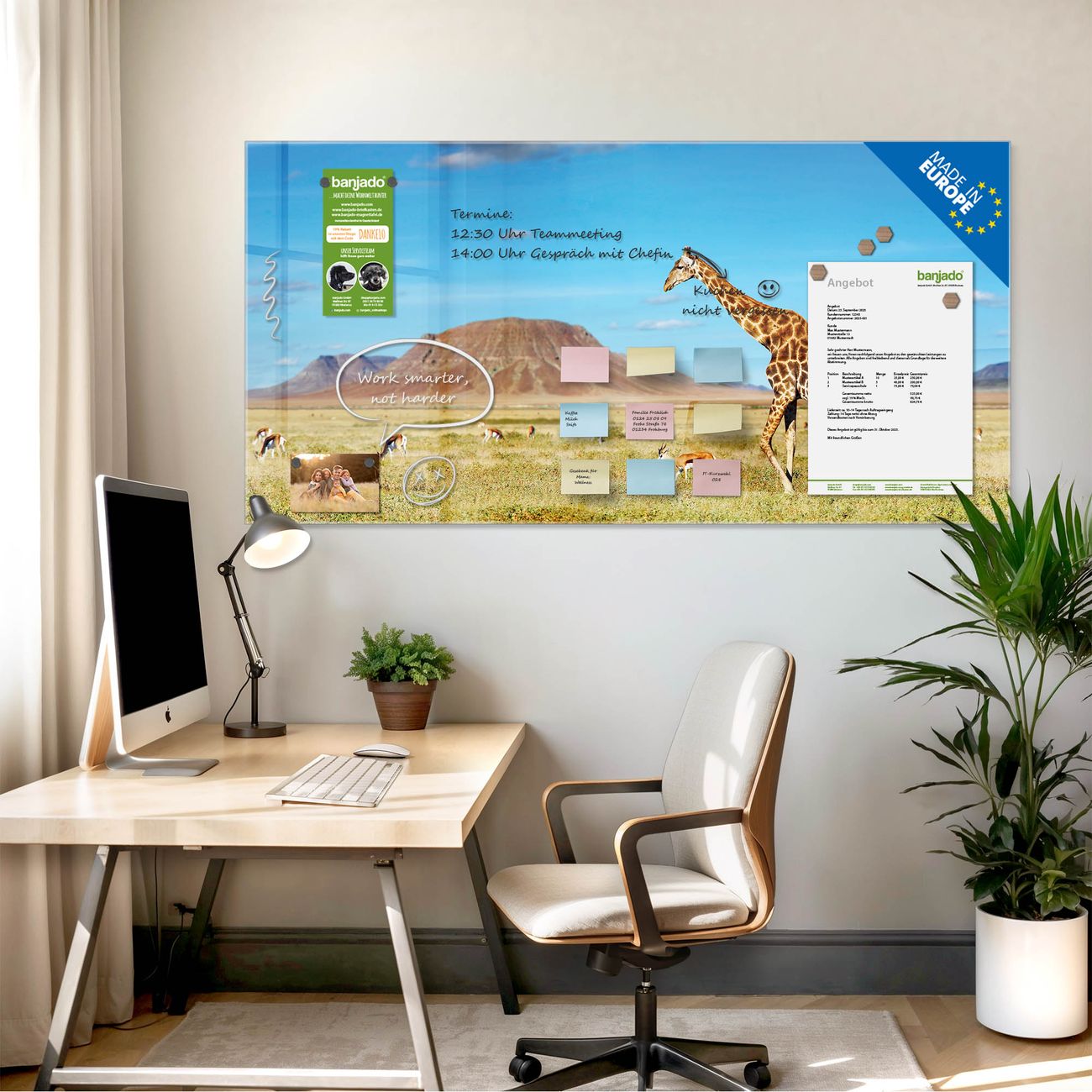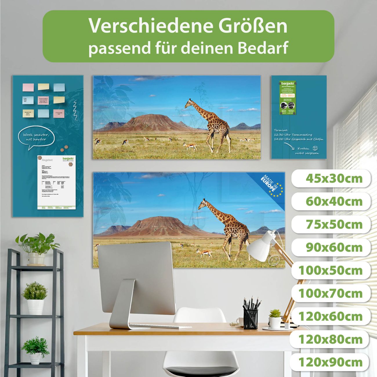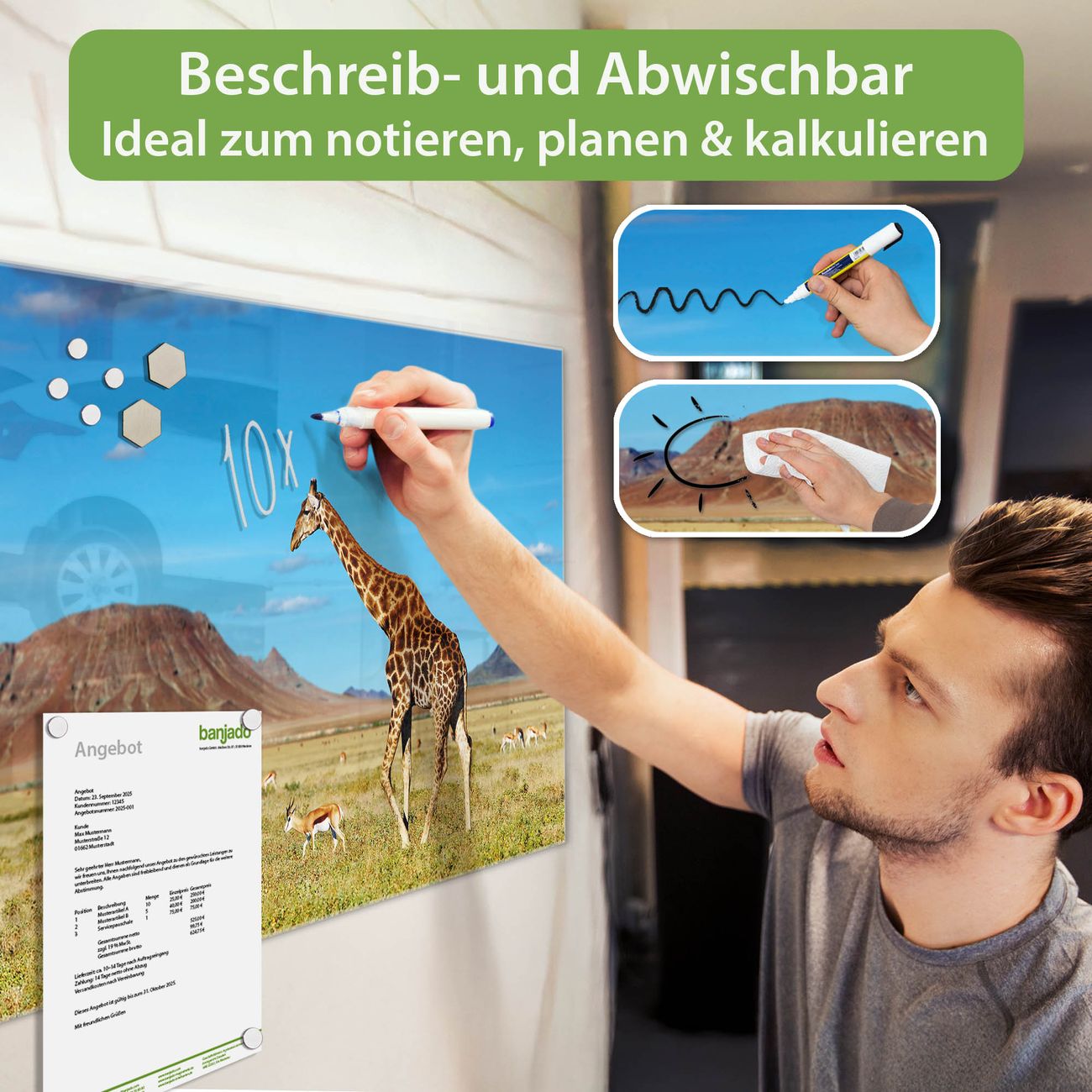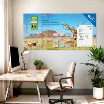 Material: 4mm Sicherheitsglas mit Metallrückwand Eigenschaften: beschreibbar, magnetisch, kratzfest Maße: 100x50x0,6cm, 7,50kg schwer Motiv Nummer 10656 Giraffe Zubehör: inklusive 4 Neodym-Magnete