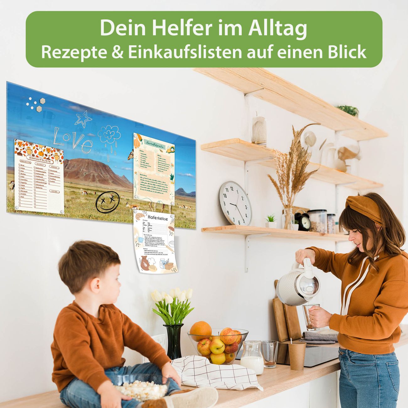 Auf der glatten Glasoberfläche lassen sich Termine, Rezepte oder Notizen ganz einfach mit Kreidestiften festhalten und rückstandslos entfernen. Starke Neodym-Magnete halten Ihre wichtigsten Erinnerungen sicher an Ort und Stelle. So entsteht Ihre ganz persönliche Ideenwand - jeden Tag neu.