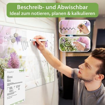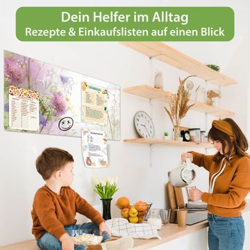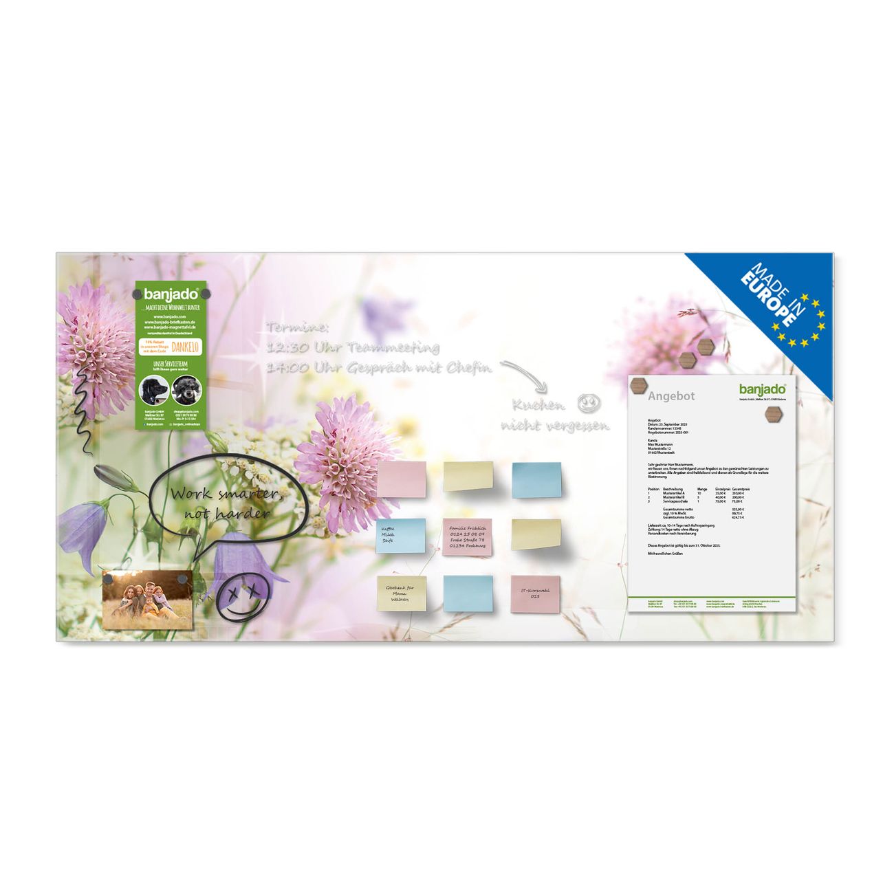 Material: 4mm Sicherheitsglas mit Metallrückwand Eigenschaften: beschreibbar, magnetisch, kratzfest Maße: 100x50x0,6cm, 7,50kg schwer Motiv Nummer 11269 Glitzernde Wiese Zubehör: inklusive 4 Neodym-Magnete