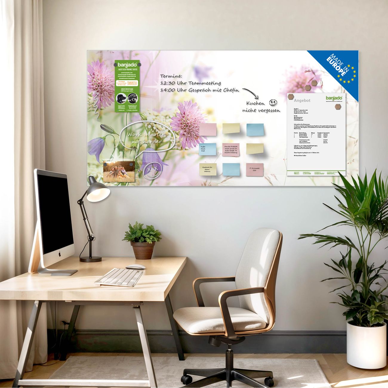 Die banjado Glas Magnettafel mit dem Motiv Motiv Glitzernde Wiese verbindet Funktionalität mit Stil. Sie ersetzt das Zettelchaos durch klare Strukturen und bringt dabei eine warme, natürliche Atmosphäre in Ihr Zuhause. Ob im Büro, in der Küche oder im Eingangsbereich - dieses Design-Board zieht Blicke an und sorgt für Ordnung mit Charakter.