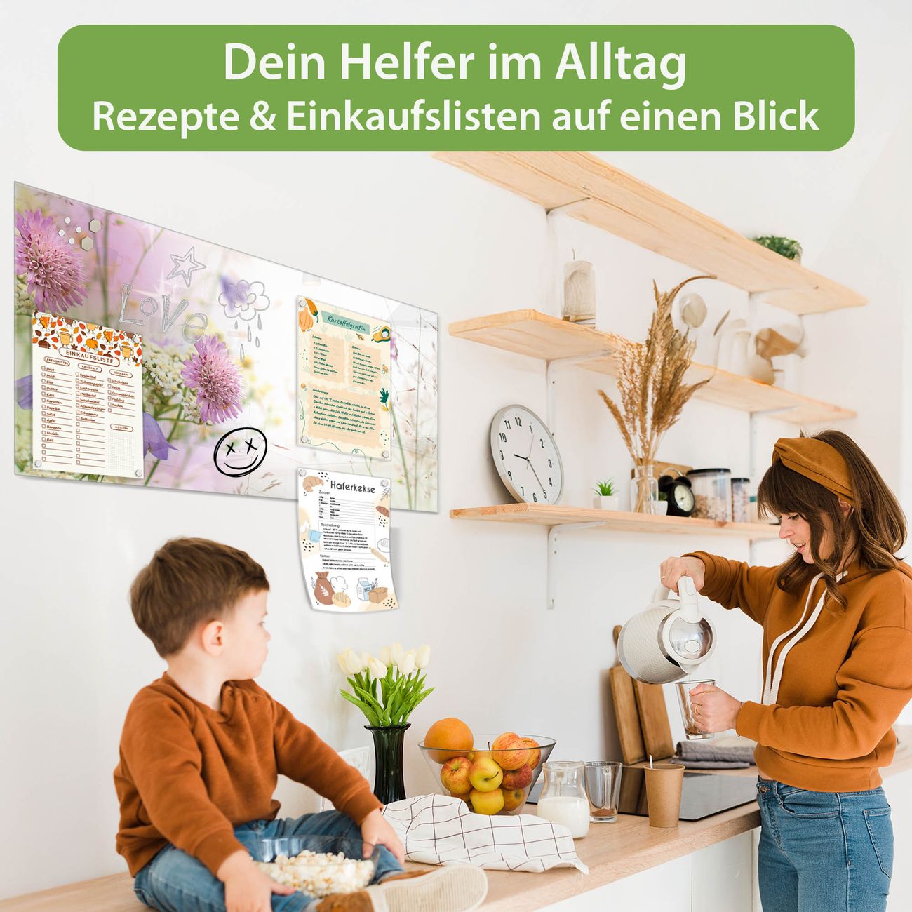 Auf der glatten Glasoberfläche lassen sich Termine, Rezepte oder Notizen ganz einfach mit Kreidestiften festhalten und rückstandslos entfernen. Starke Neodym-Magnete halten Ihre wichtigsten Erinnerungen sicher an Ort und Stelle. So entsteht Ihre ganz persönliche Ideenwand - jeden Tag neu.