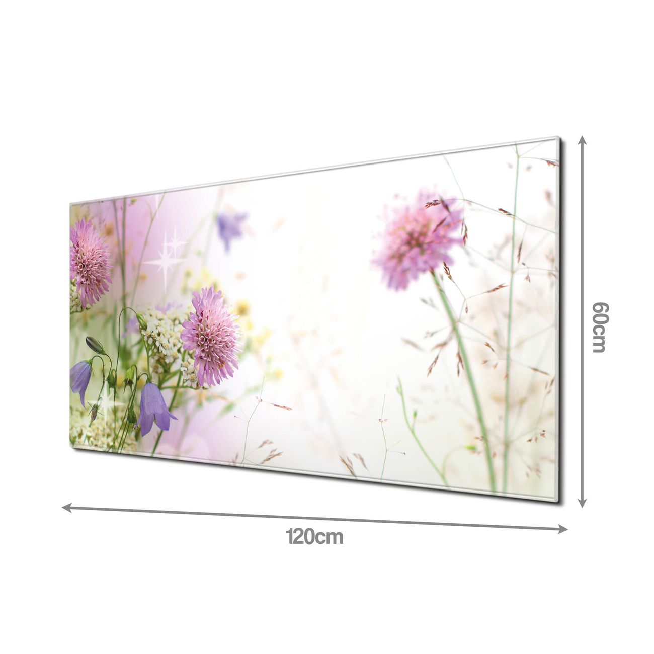 Material: 4mm Sicherheitsglas mit Metallrückwand Eigenschaften: beschreibbar, magnetisch, kratzfest Maße: 120x60x0,6cm, 10,80kg schwer Motiv Nummer 11269 Glitzernde Wiese Zubehör: inklusive 4 Neodym-Magnete