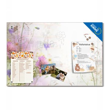 Material: 4mm Sicherheitsglas mit Metallrückwand Eigenschaften: beschreibbar, magnetisch, kratzfest Maße: 75x50x0,6cm, 5,63kg schwer Motiv Nummer 11269 Glitzernde Wiese Zubehör: inklusive 4 Neodym-Magnete
