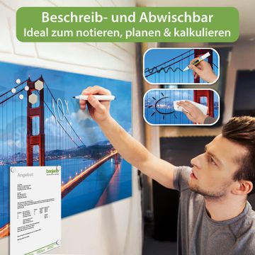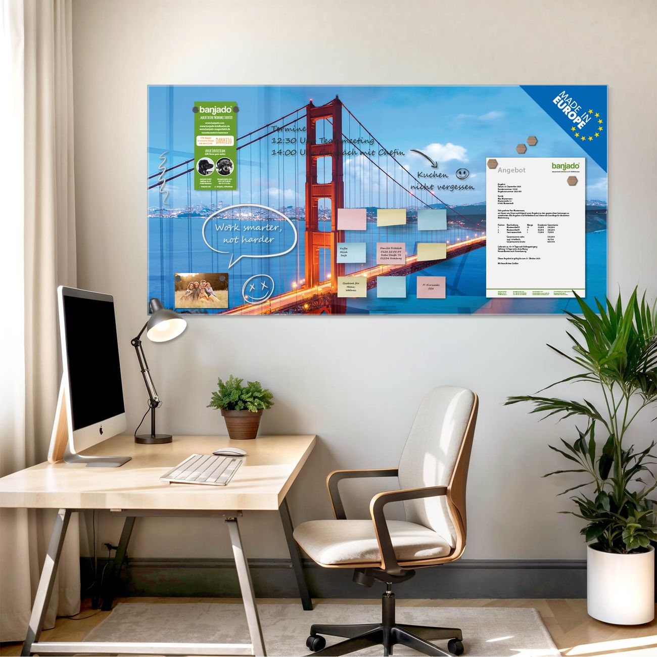 Die banjado Glas Magnettafel mit dem Motiv Motiv Golden Gate Bridge verbindet Funktionalität mit Stil. Sie ersetzt das Zettelchaos durch klare Strukturen und bringt dabei eine warme, natürliche Atmosphäre in Ihr Zuhause. Ob im Büro, in der Küche oder im Eingangsbereich - dieses Design-Board zieht Blicke an und sorgt für Ordnung mit Charakter.