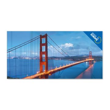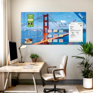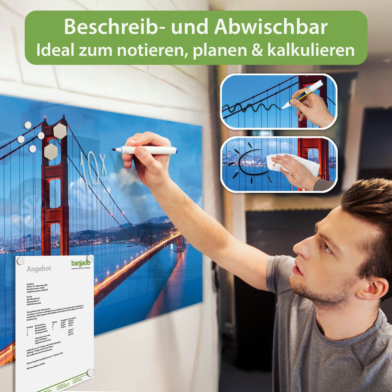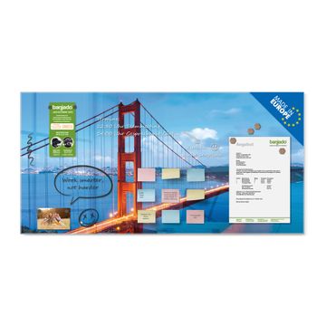 Material: 4mm Sicherheitsglas mit Metallrückwand Eigenschaften: beschreibbar, magnetisch, kratzfest Maße: 120x60x0,6cm, 10,80kg schwer Motiv Nummer 10241 Golden Gate Bridge Zubehör: inklusive 4 Neodym-Magnete
