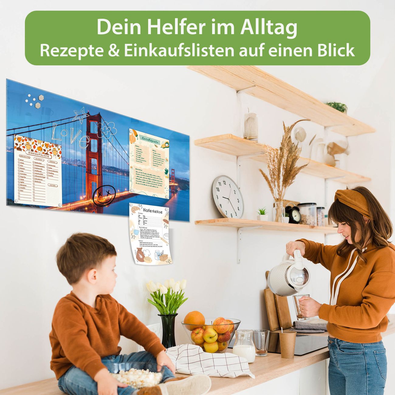 Ein Stück Design, das Ihren Alltag organisiert. Schreiben, heften, inspirieren - alles an einem Ort. Qualität, die man spürt. Montage leicht gemacht. Handwerk mit Herz - veredelt in Sachsen. Einzigartiges Design mit Motiv Motiv Golden Gate Bridge Beschreibbare Glasoberfläche, leicht zu reinigen Starke Magnetkraft durch Stahlrückwand Inklusive 4 Neodym-Magneten Flexible Montageoptionen Handveredelt in Sachsen - Qualität, die bleibt