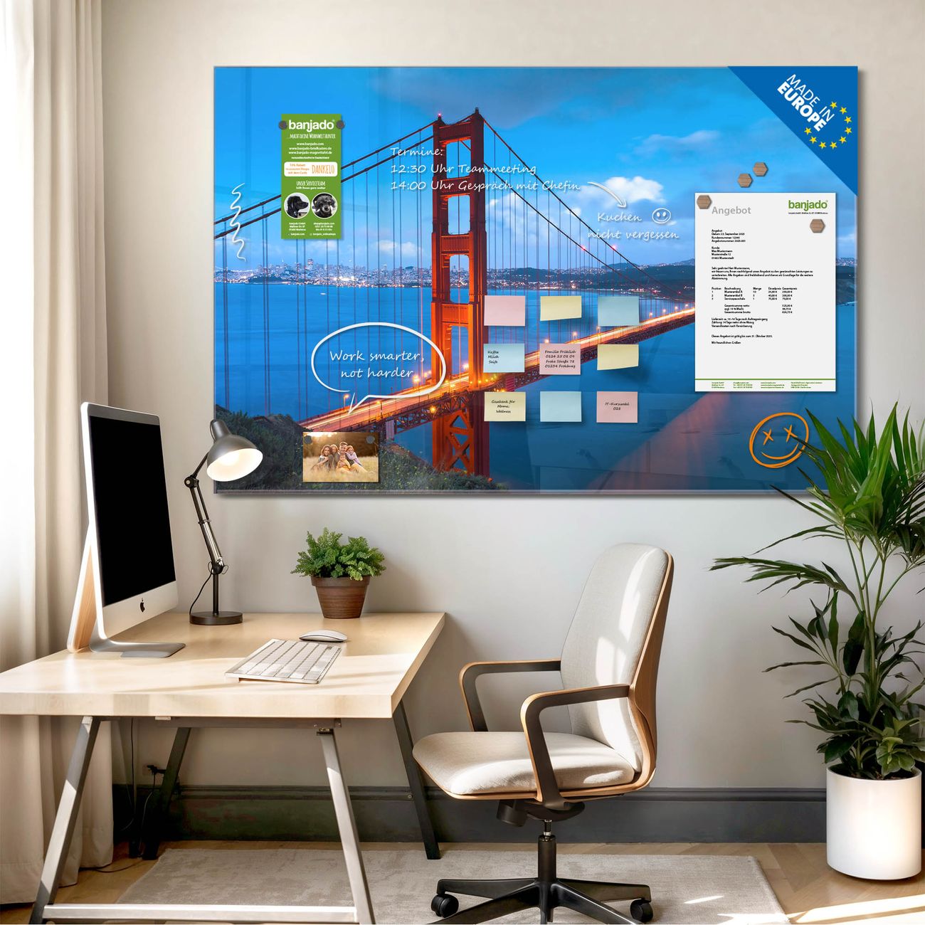 Die banjado Glas Magnettafel mit dem Motiv Motiv Golden Gate Bridge verbindet Funktionalität mit Stil. Sie ersetzt das Zettelchaos durch klare Strukturen und bringt dabei eine warme, natürliche Atmosphäre in Ihr Zuhause. Ob im Büro, in der Küche oder im Eingangsbereich - dieses Design-Board zieht Blicke an und sorgt für Ordnung mit Charakter.