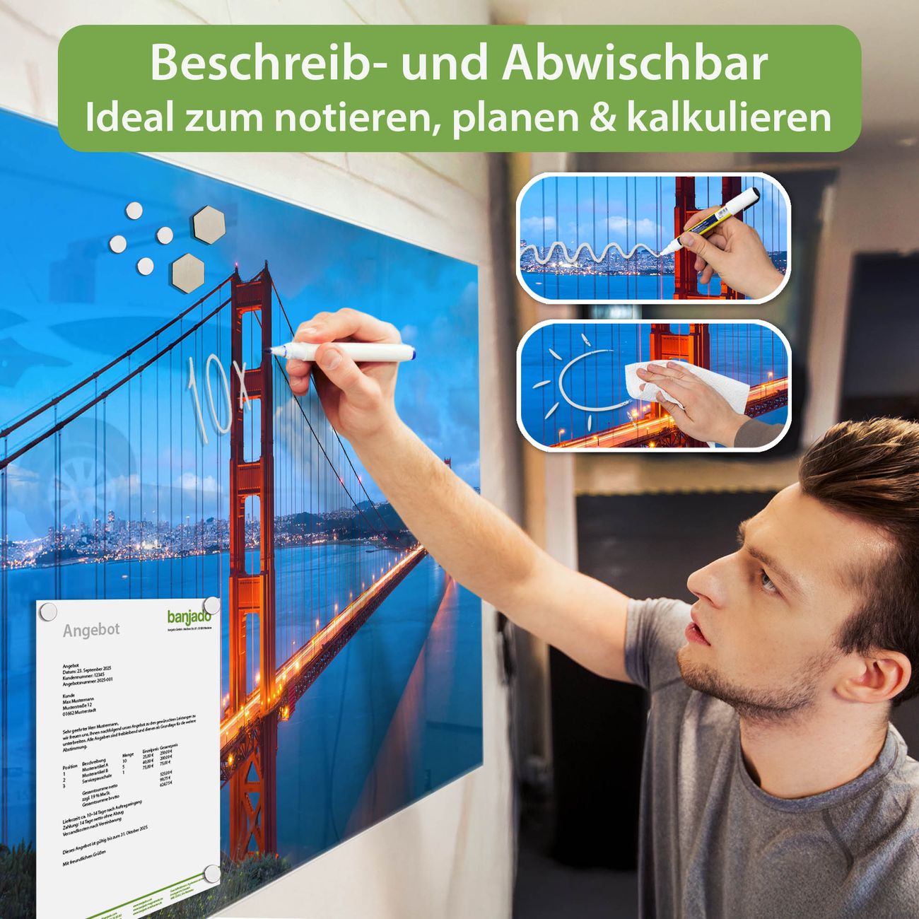Material: 4mm Sicherheitsglas mit Metallrückwand Eigenschaften: beschreibbar, magnetisch, kratzfest Maße: 120x80x0,6cm, 14,40kg schwer Motiv Nummer 10241 Golden Gate Bridge Zubehör: inklusive 4 Neodym-Magnete