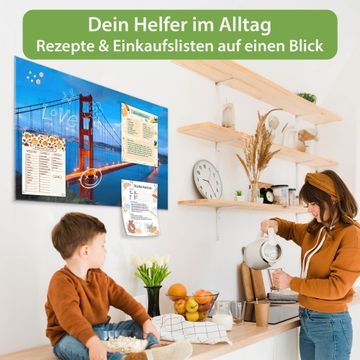Ein Stück Design, das Ihren Alltag organisiert. Schreiben, heften, inspirieren - alles an einem Ort. Qualität, die man spürt. Montage leicht gemacht. Handwerk mit Herz - veredelt in Sachsen. Einzigartiges Design mit Motiv Motiv Golden Gate Bridge Beschreibbare Glasoberfläche, leicht zu reinigen Starke Magnetkraft durch Stahlrückwand Inklusive 4 Neodym-Magneten Flexible Montageoptionen Handveredelt in Sachsen - Qualität, die bleibt