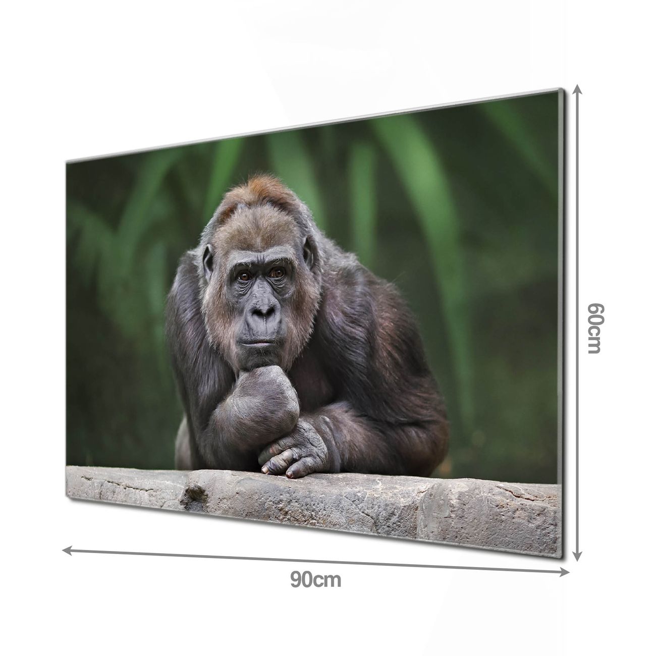 Material: 4mm Sicherheitsglas mit Metallrückwand Eigenschaften: beschreibbar, magnetisch, kratzfest Maße: 90x60x0,6cm, 8,10kg schwer Motiv Nummer 10509 Gorilla Zubehör: inklusive 4 Neodym-Magnete