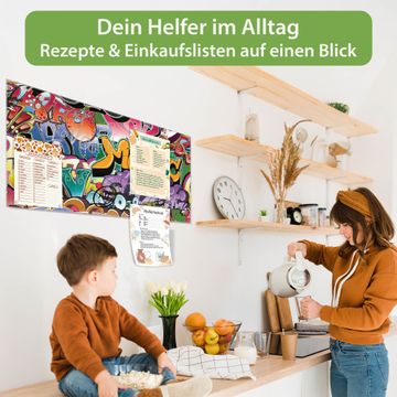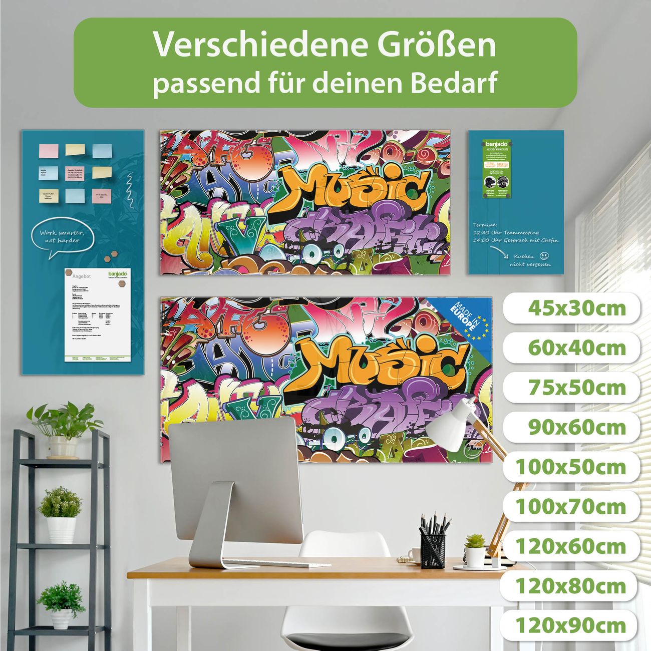 Material: 4mm Sicherheitsglas mit Metallrückwand Eigenschaften: beschreibbar, magnetisch, kratzfest Maße: 100x50x0,6cm, 7,50kg schwer Motiv Nummer 10203 Graffiti Zubehör: inklusive 4 Neodym-Magnete
