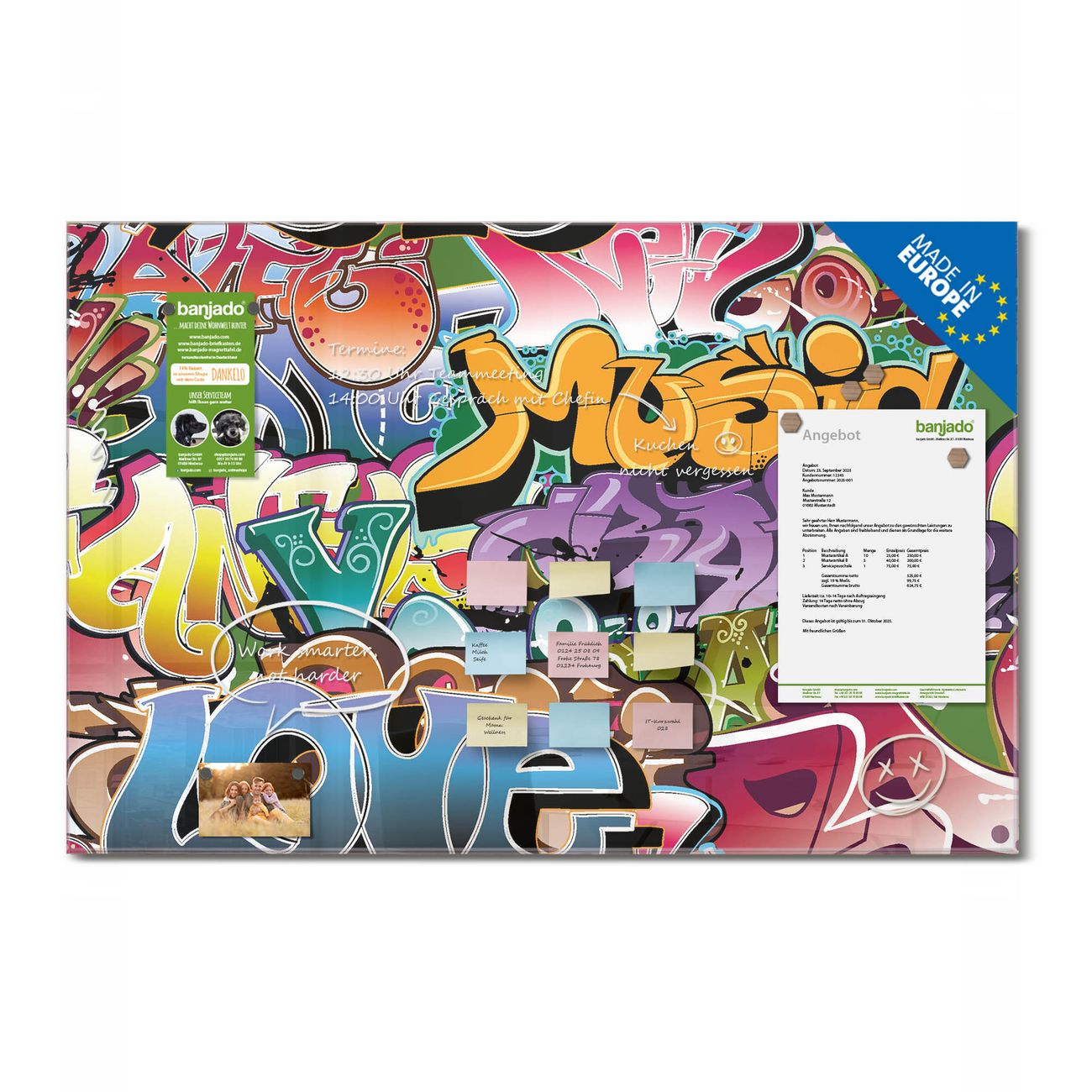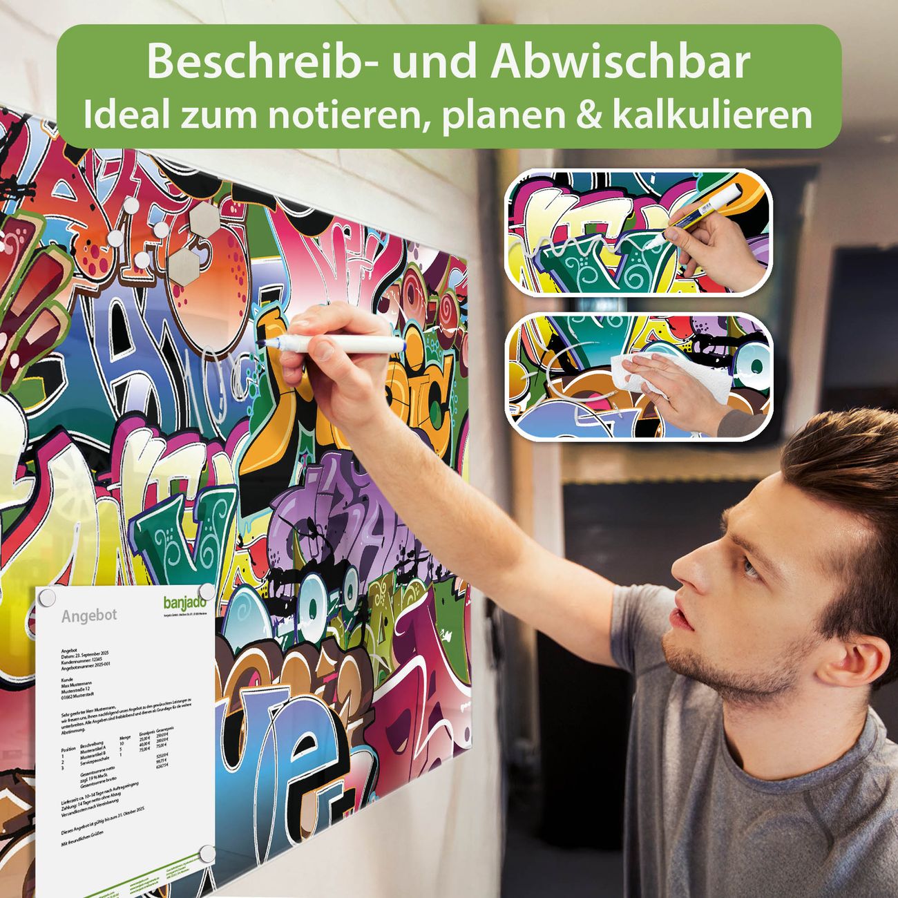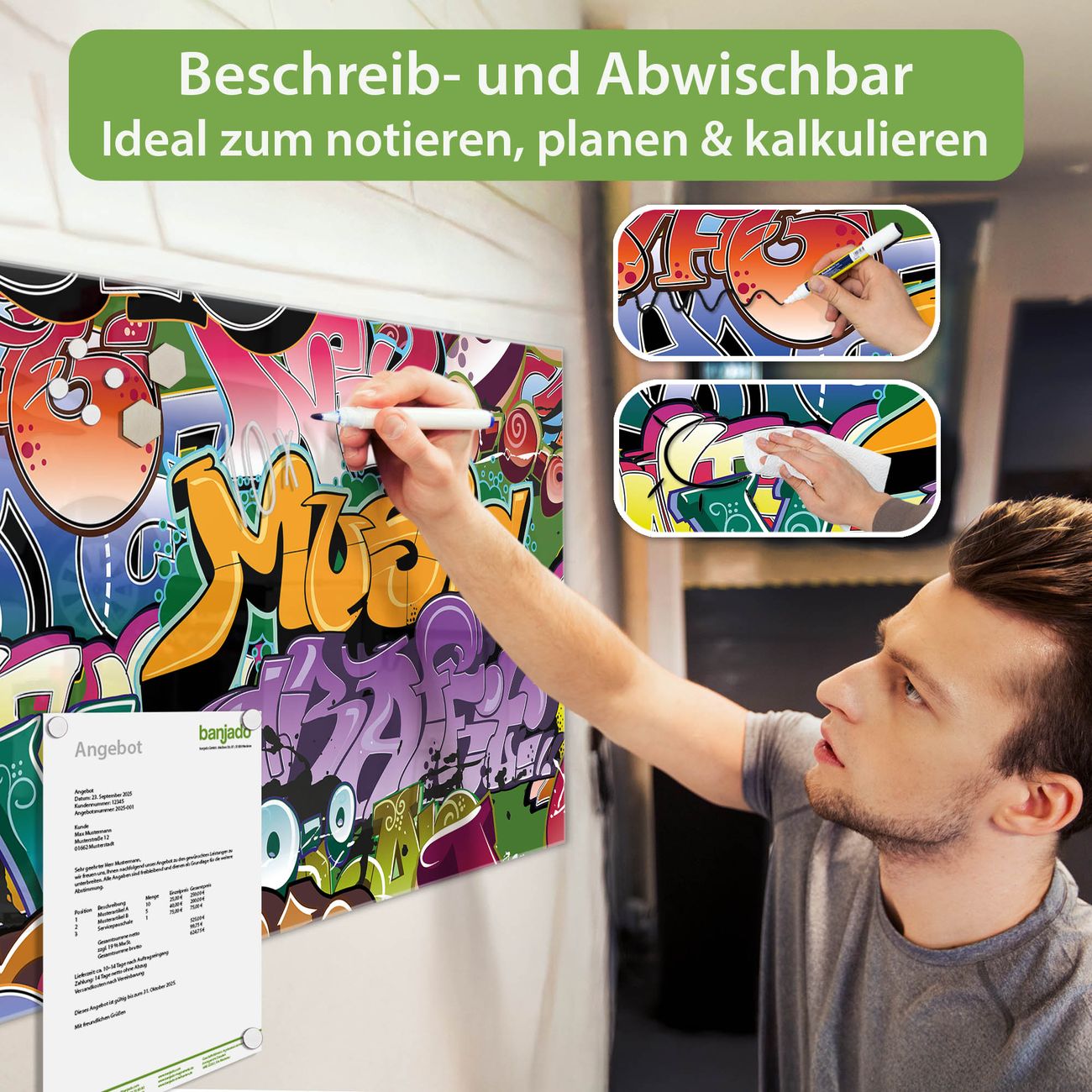 Material: 4mm Sicherheitsglas mit Metallrückwand Eigenschaften: beschreibbar, magnetisch, kratzfest Maße: 120x60x0,6cm, 10,80kg schwer Motiv Nummer 10203 Graffiti Zubehör: inklusive 4 Neodym-Magnete