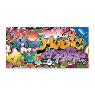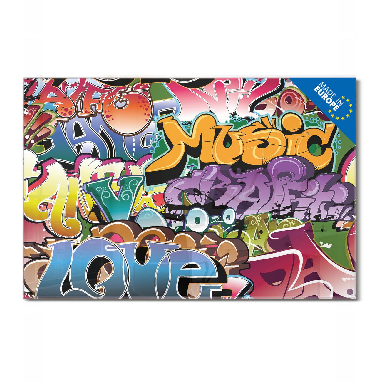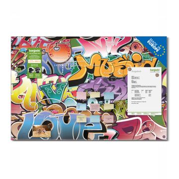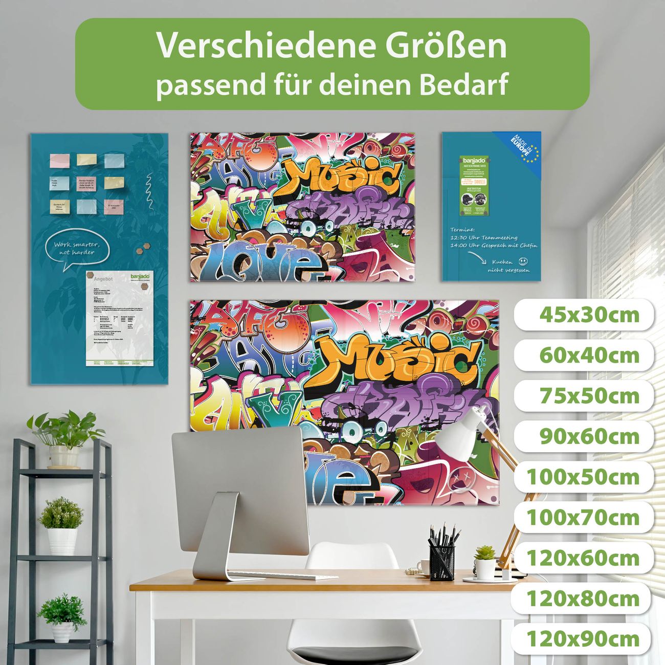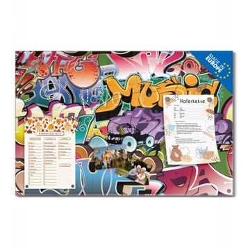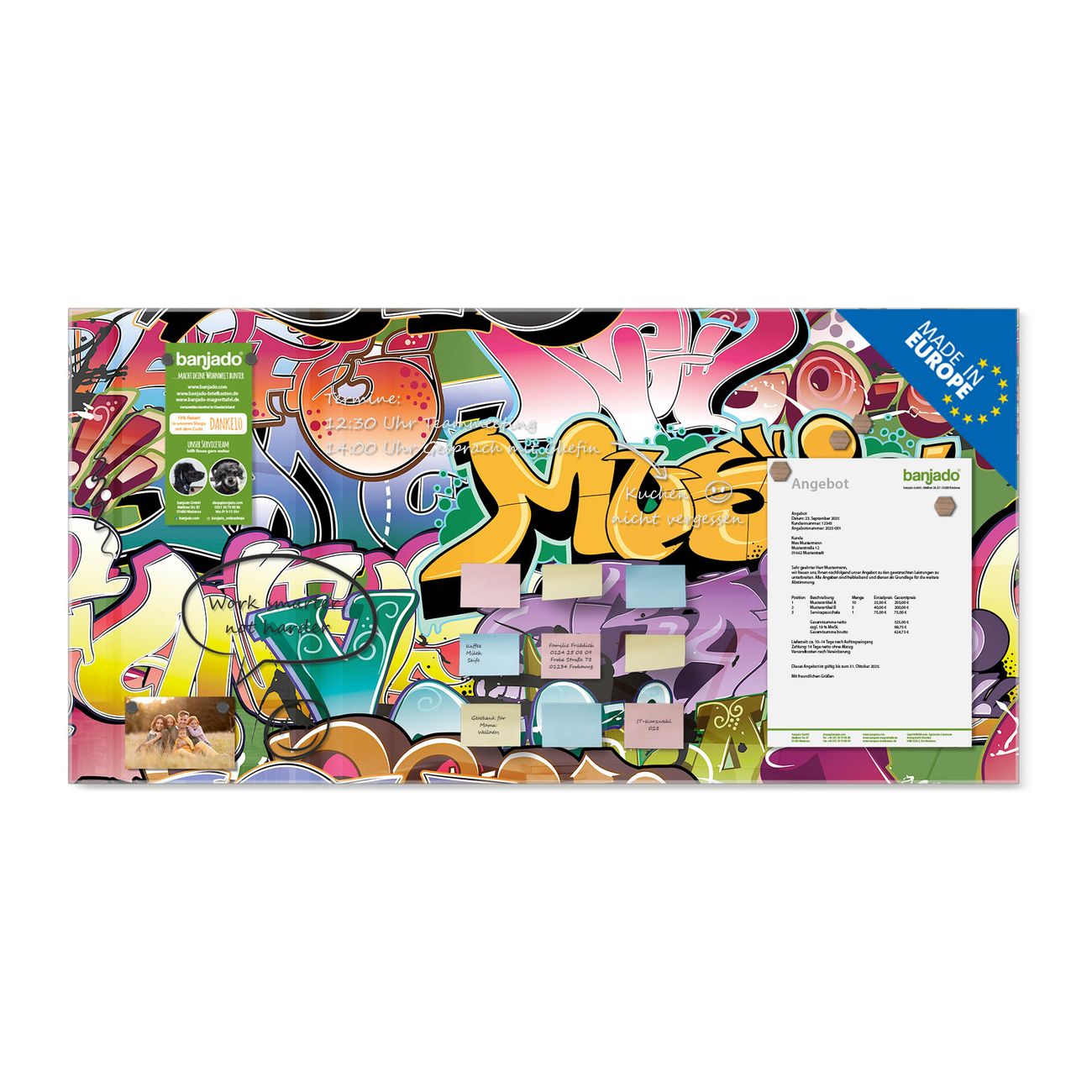 Material: 4mm Sicherheitsglas mit Metallrückwand Eigenschaften: beschreibbar, magnetisch, kratzfest Maße: 120x60x0,6cm, 10,80kg schwer Motiv Nummer 10203 Graffiti Zubehör: inklusive 4 Neodym-Magnete
