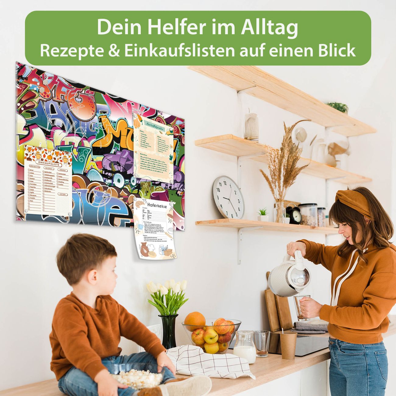 Ein Stück Design, das Ihren Alltag organisiert. Schreiben, heften, inspirieren - alles an einem Ort. Qualität, die man spürt. Montage leicht gemacht. Handwerk mit Herz - veredelt in Sachsen. Einzigartiges Design mit Motiv Motiv Graffiti Beschreibbare Glasoberfläche, leicht zu reinigen Starke Magnetkraft durch Stahlrückwand Inklusive 4 Neodym-Magneten Flexible Montageoptionen Handveredelt in Sachsen - Qualität, die bleibt