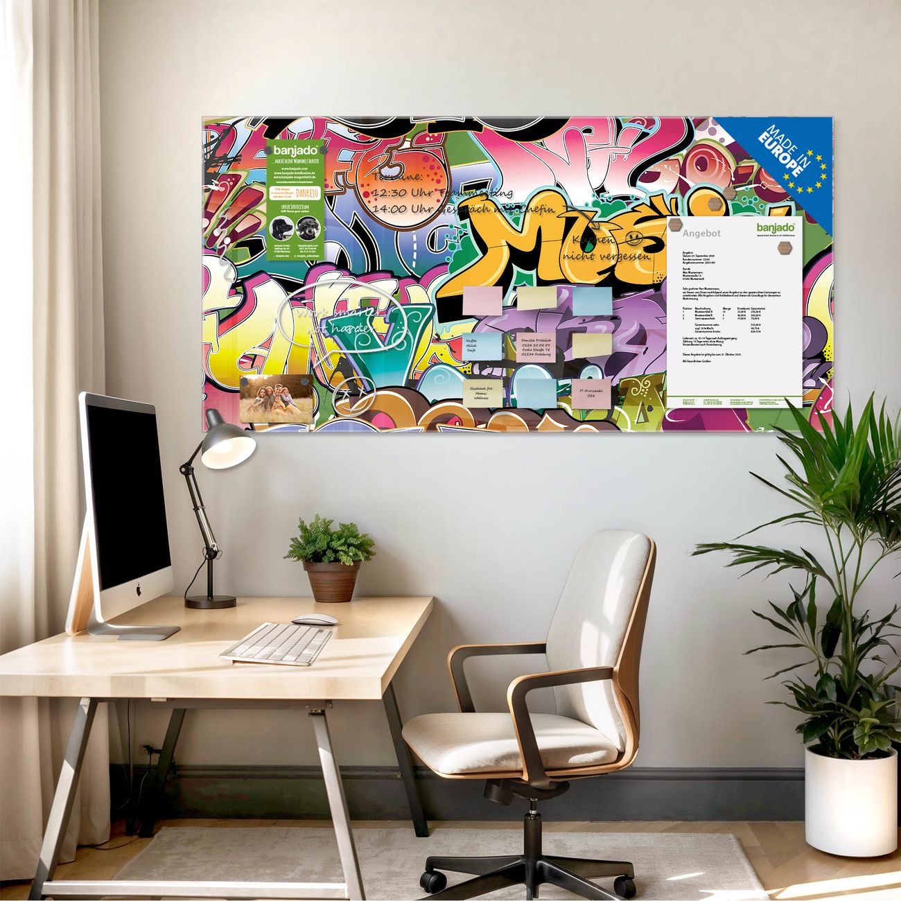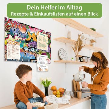 Die banjado Glas Magnettafel mit dem Motiv Motiv Graffiti verbindet Funktionalität mit Stil. Sie ersetzt das Zettelchaos durch klare Strukturen und bringt dabei eine warme, natürliche Atmosphäre in Ihr Zuhause. Ob im Büro, in der Küche oder im Eingangsbereich - dieses Design-Board zieht Blicke an und sorgt für Ordnung mit Charakter.