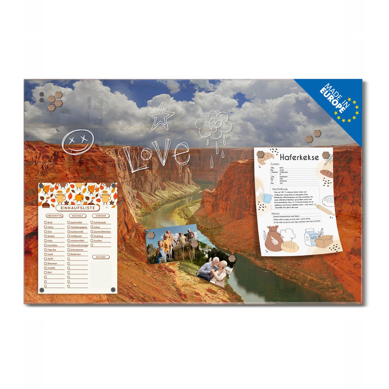 Ein Stück Design, das Ihren Alltag organisiert. Schreiben, heften, inspirieren - alles an einem Ort. Qualität, die man spürt. Montage leicht gemacht. Handwerk mit Herz - veredelt in Sachsen. Einzigartiges Design mit Motiv Motiv Grand Canyon Beschreibbare Glasoberfläche, leicht zu reinigen Starke Magnetkraft durch Stahlrückwand Inklusive 4 Neodym-Magneten Flexible Montageoptionen Handveredelt in Sachsen - Qualität, die bleibt