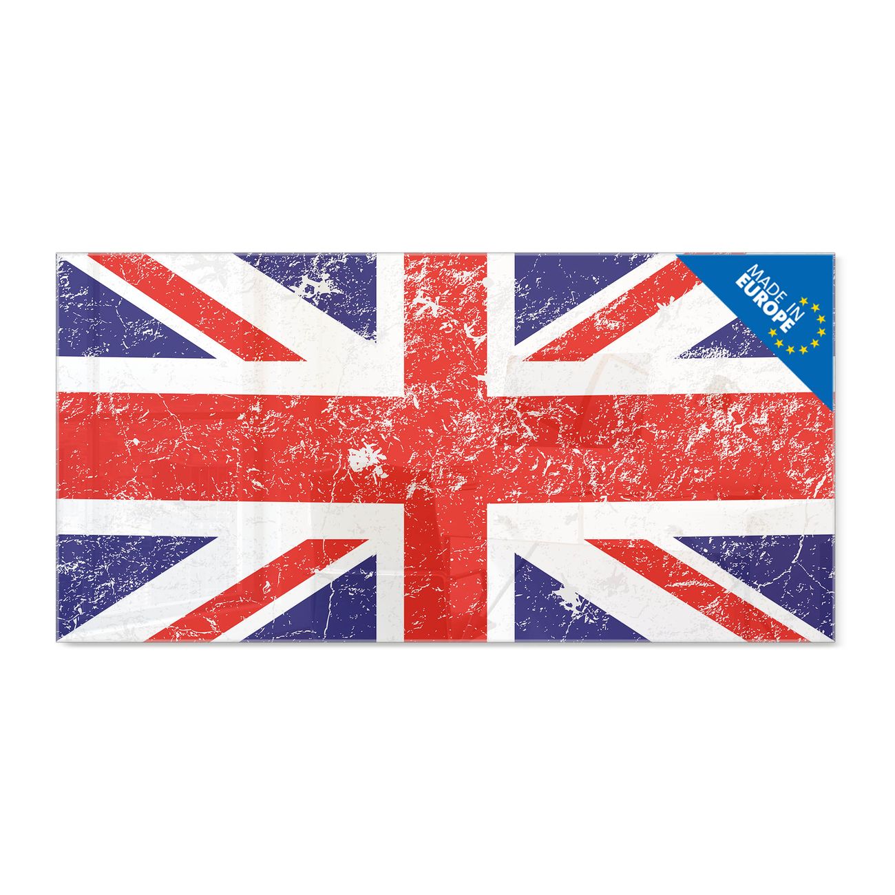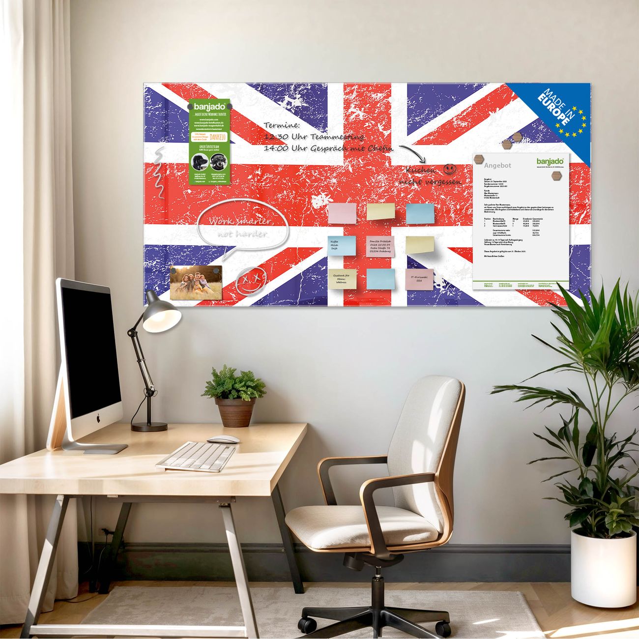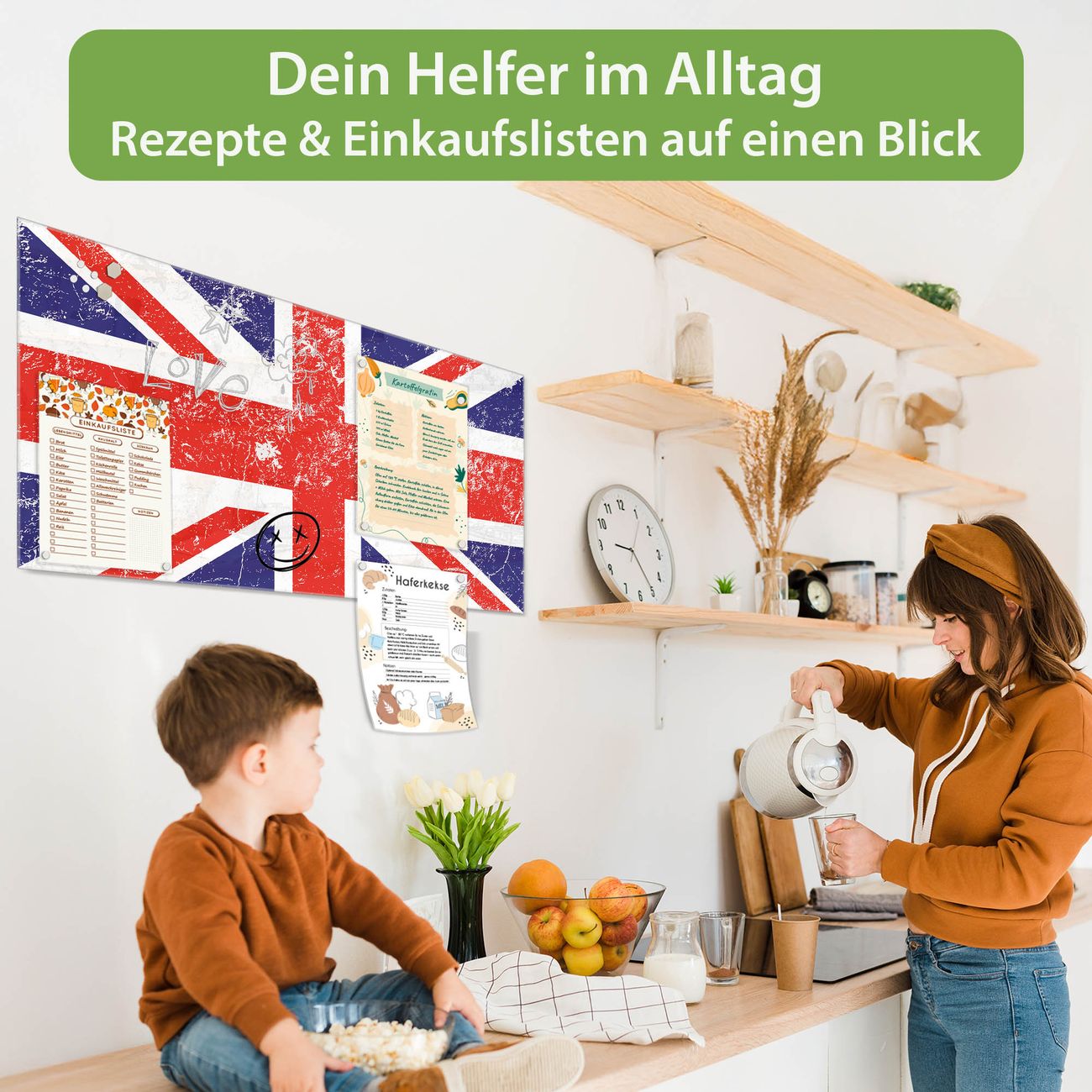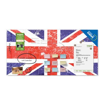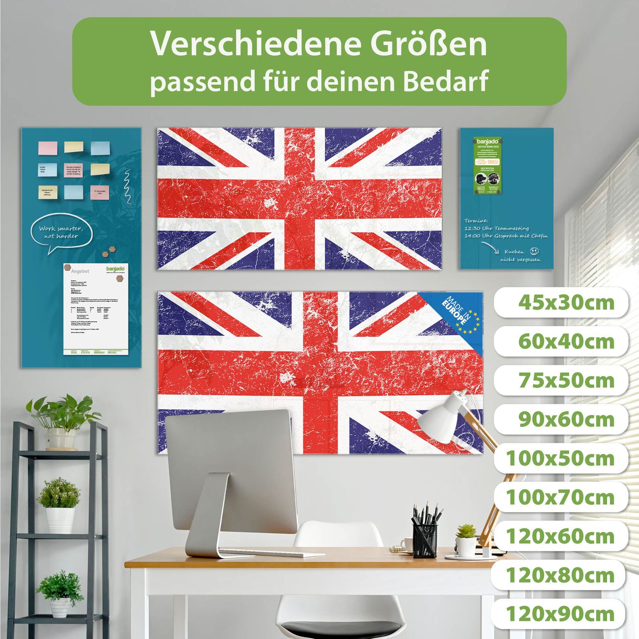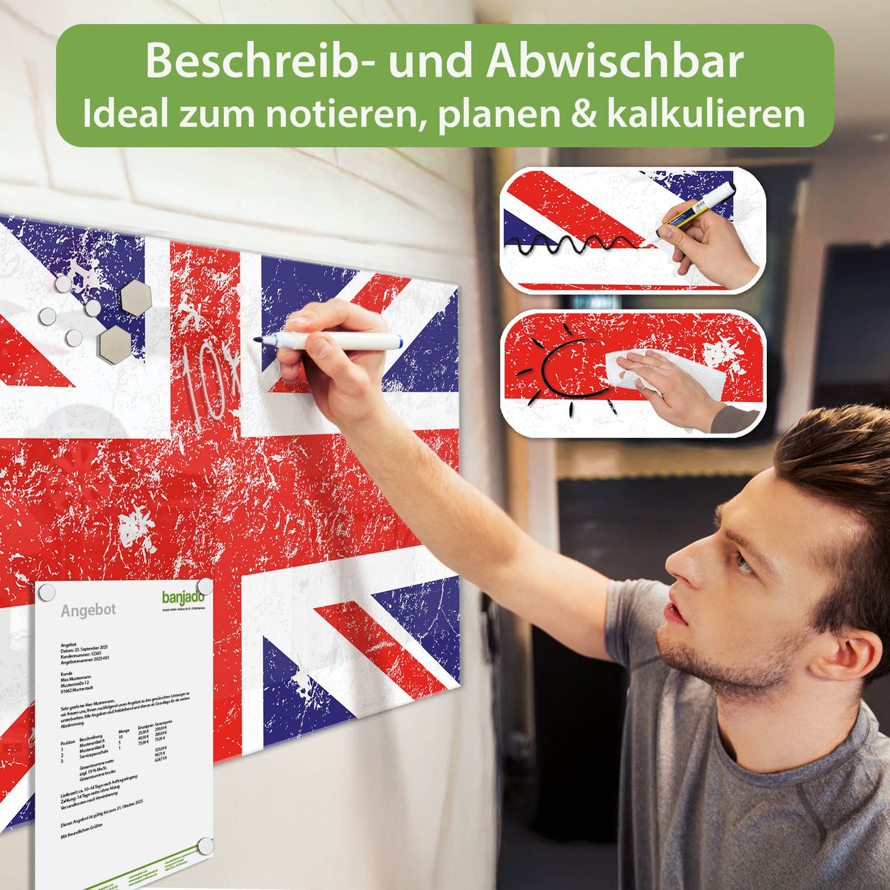 Material: 4mm Sicherheitsglas mit Metallrückwand Eigenschaften: beschreibbar, magnetisch, kratzfest Maße: 100x50x0,6cm, 7,50kg schwer Motiv Nummer 10206 Great Britain Zubehör: inklusive 4 Neodym-Magnete