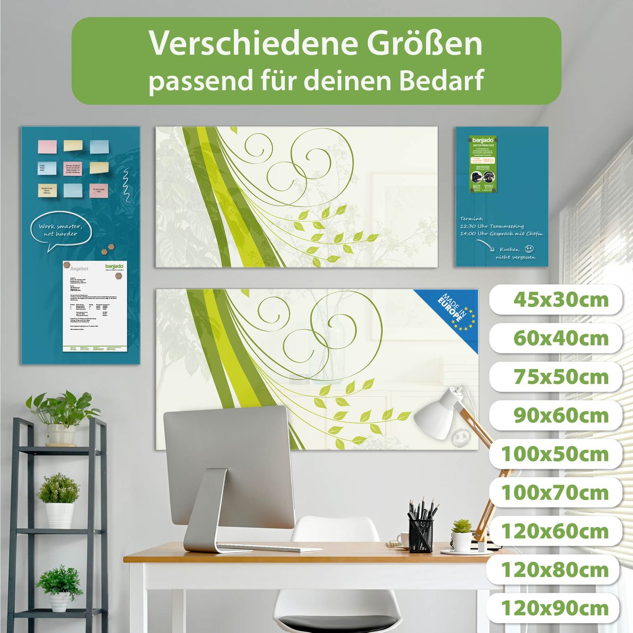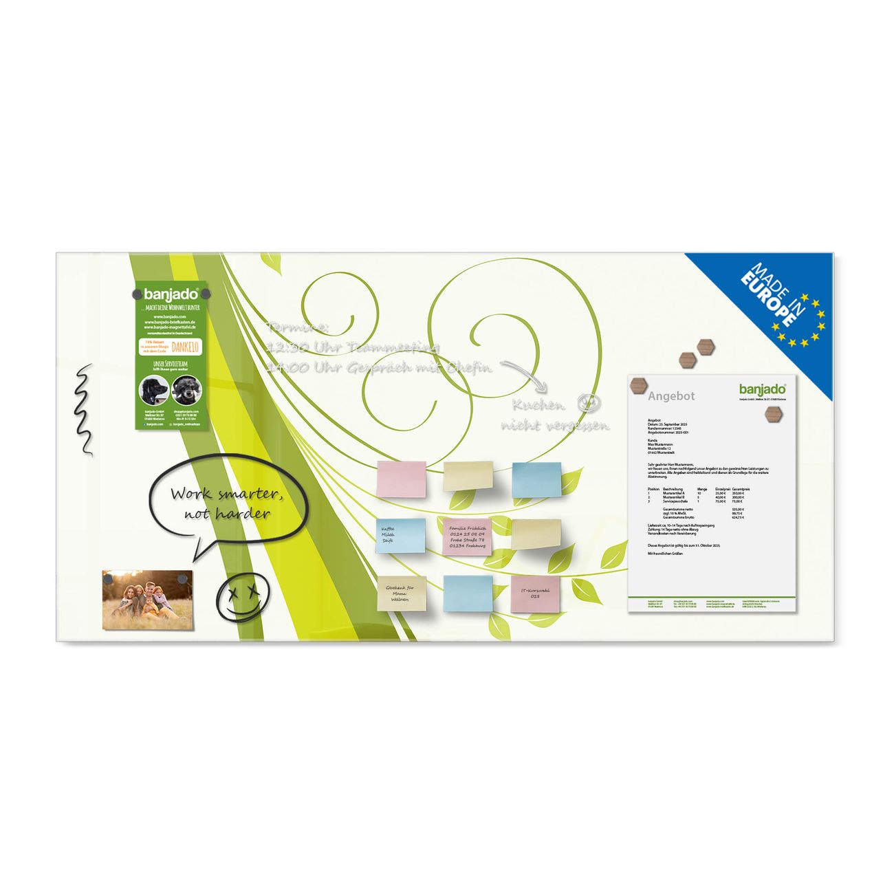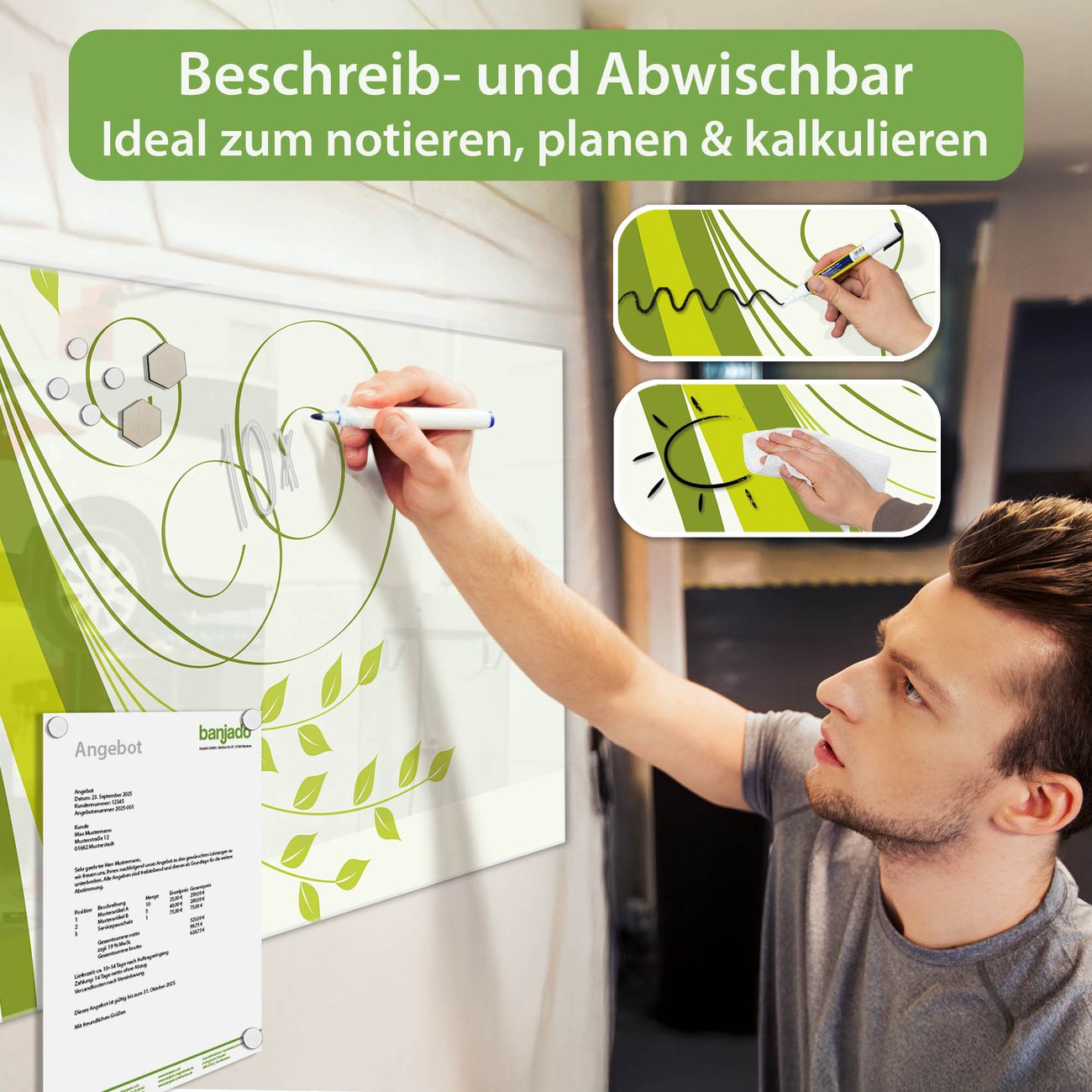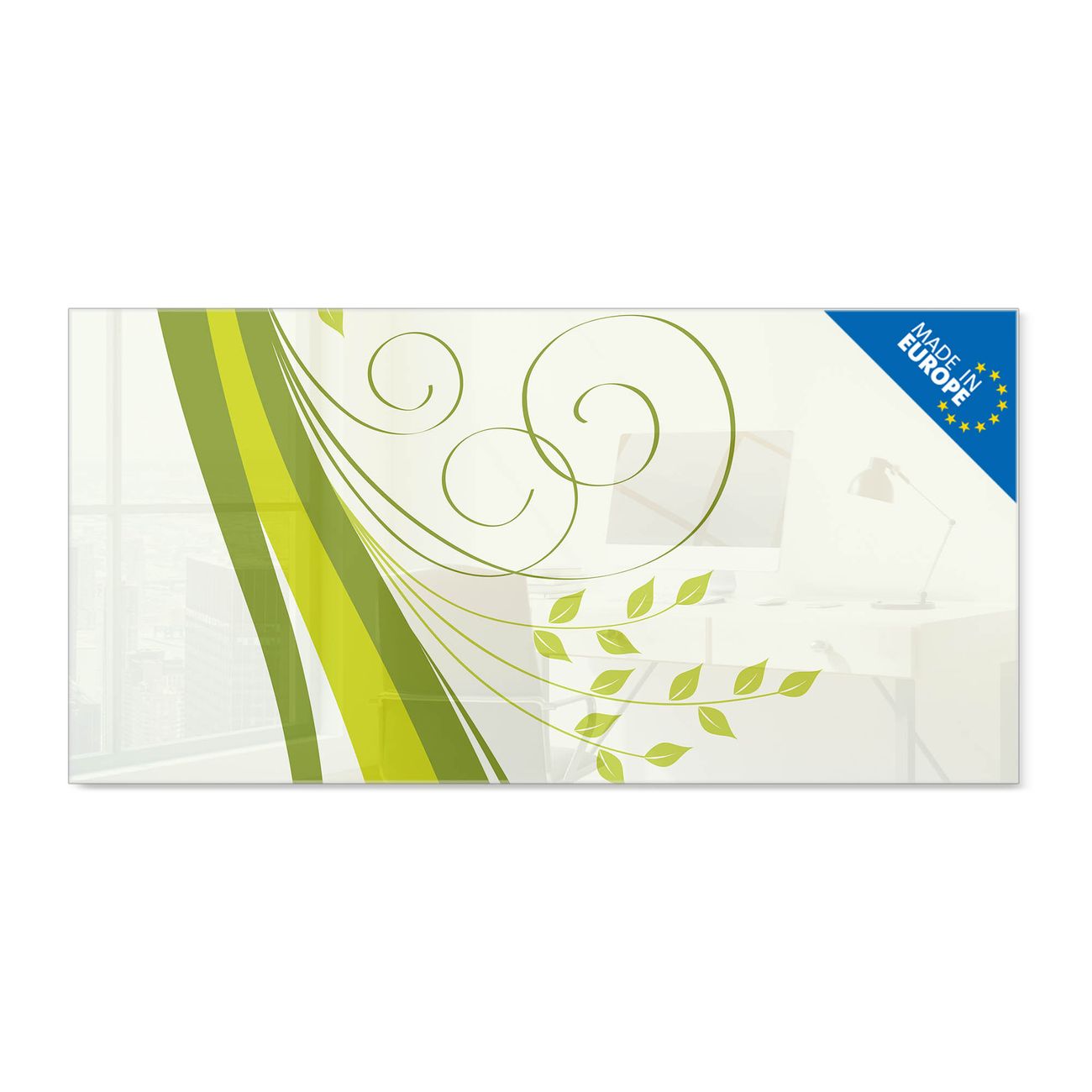 Material: 4mm Sicherheitsglas mit Metallrückwand Eigenschaften: beschreibbar, magnetisch, kratzfest Maße: 120x60x0,6cm, 10,80kg schwer Motiv Nummer 10331 Green Swirl Zubehör: inklusive 4 Neodym-Magnete