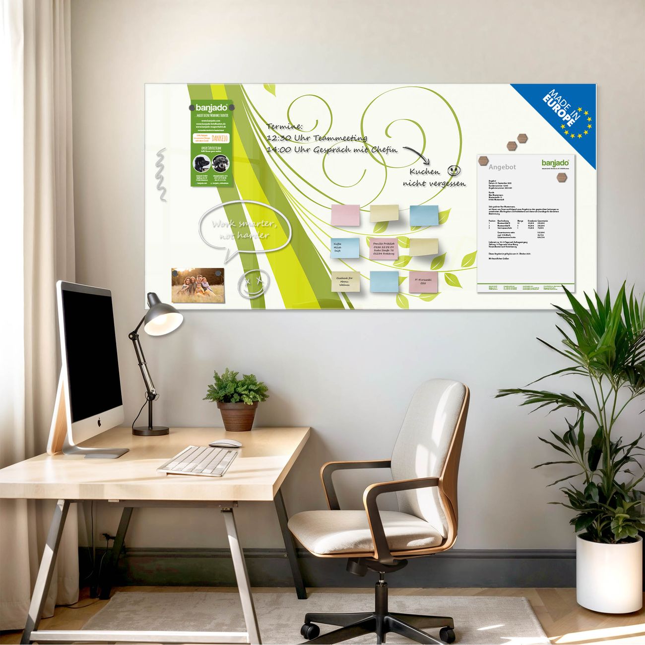 Die banjado Glas Magnettafel mit dem Motiv Motiv Green Swirl verbindet Funktionalität mit Stil. Sie ersetzt das Zettelchaos durch klare Strukturen und bringt dabei eine warme, natürliche Atmosphäre in Ihr Zuhause. Ob im Büro, in der Küche oder im Eingangsbereich - dieses Design-Board zieht Blicke an und sorgt für Ordnung mit Charakter.