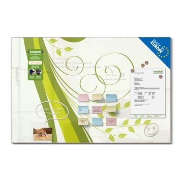 Material: 4mm Sicherheitsglas mit Metallrückwand Eigenschaften: beschreibbar, magnetisch, kratzfest Maße: 120x80x0,6cm, 14,40kg schwer Motiv Nummer 10331 Green Swirl Zubehör: inklusive 4 Neodym-Magnete