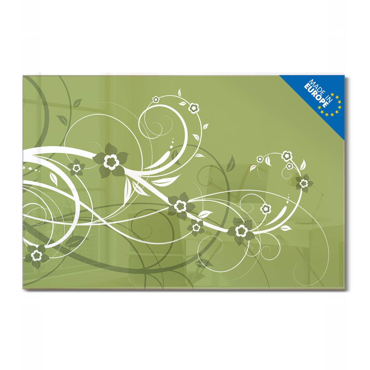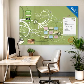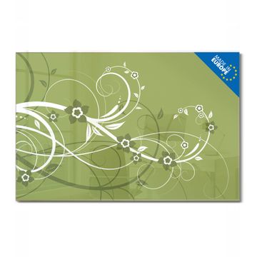 Material: 4mm Sicherheitsglas mit Metallrückwand Eigenschaften: beschreibbar, magnetisch, kratzfest Maße: 45x30x0,6cm, 2,03kg schwer Motiv Nummer 10333 Grüne Blüten Zubehör: inklusive 4 Neodym-Magnete