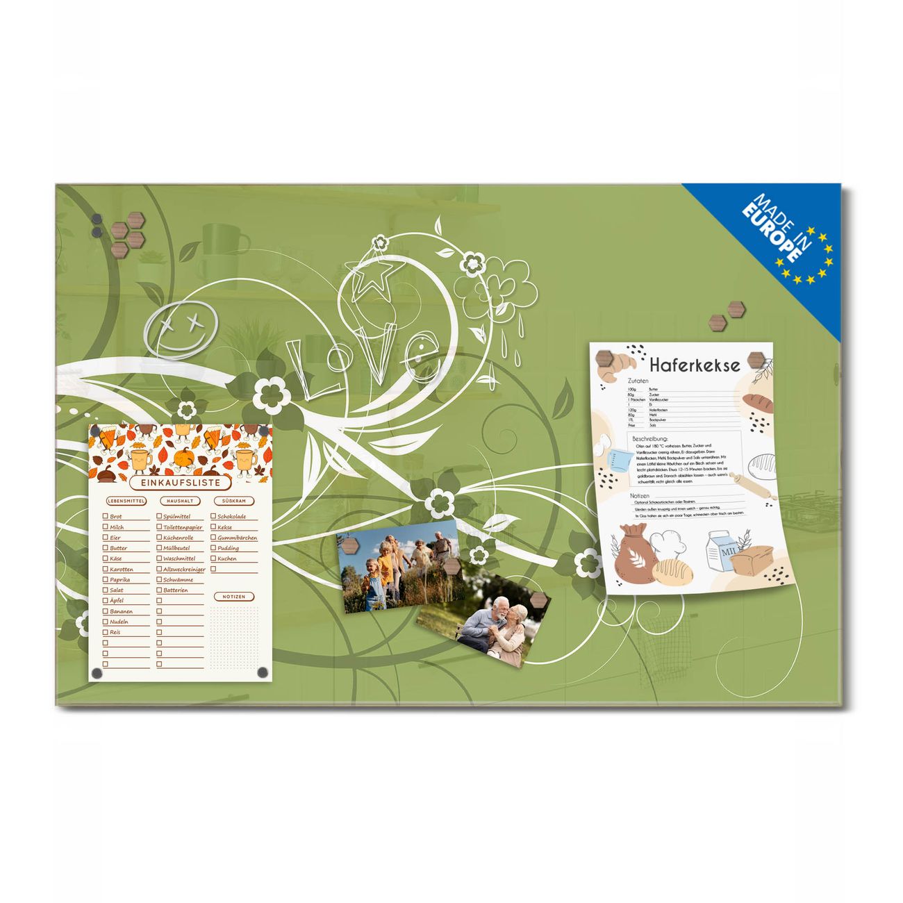 Ein Stück Design, das Ihren Alltag organisiert. Schreiben, heften, inspirieren - alles an einem Ort. Qualität, die man spürt. Montage leicht gemacht. Handwerk mit Herz - veredelt in Sachsen. Einzigartiges Design mit Motiv Motiv Grüne Blüten Beschreibbare Glasoberfläche, leicht zu reinigen Starke Magnetkraft durch Stahlrückwand Inklusive 4 Neodym-Magneten Flexible Montageoptionen Handveredelt in Sachsen - Qualität, die bleibt