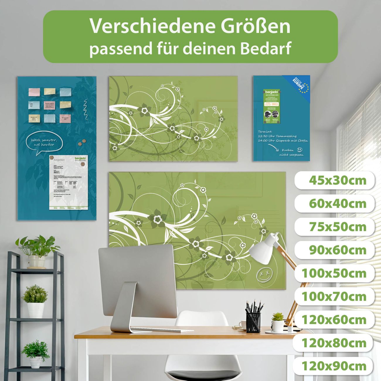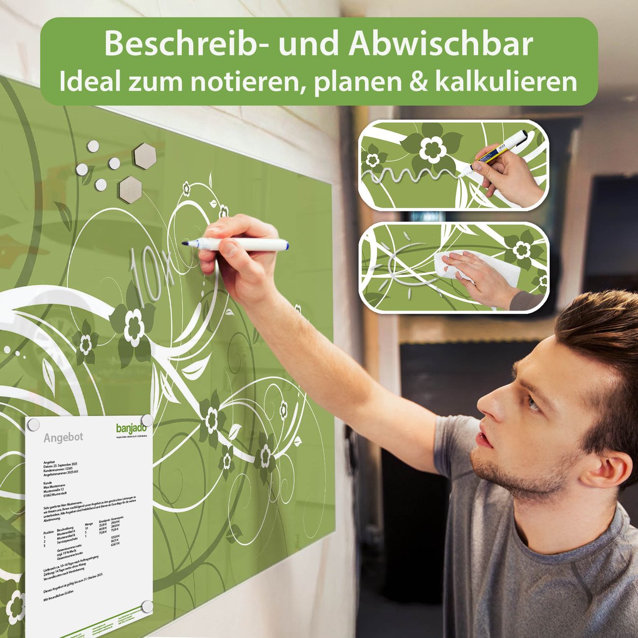 Jede Glas Magnettafel wird in unserer Werkstatt von Hand gefertigt und sorgfältig geprüft. So erhalten Sie ein echtes Qualitätsprodukt, das Funktion und Ästhetik perfekt vereint.?? Warum banjado?