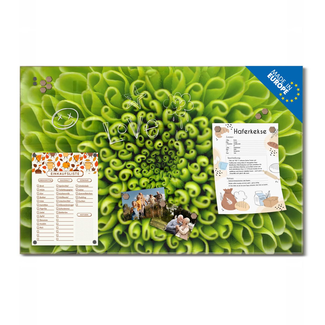 Material: 4mm Sicherheitsglas mit Metallrückwand Eigenschaften: beschreibbar, magnetisch, kratzfest Maße: 75x50x0,6cm, 5,63kg schwer Motiv Nummer 12527 Grüne Chrysantheme Zubehör: inklusive 4 Neodym-Magnete