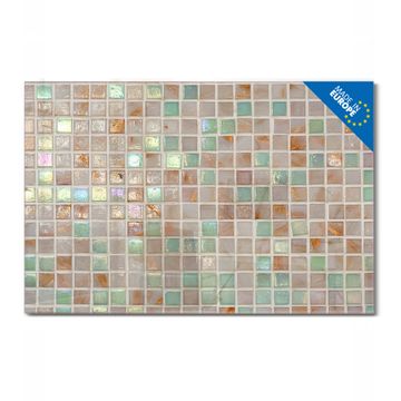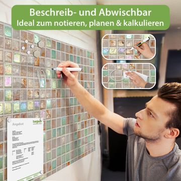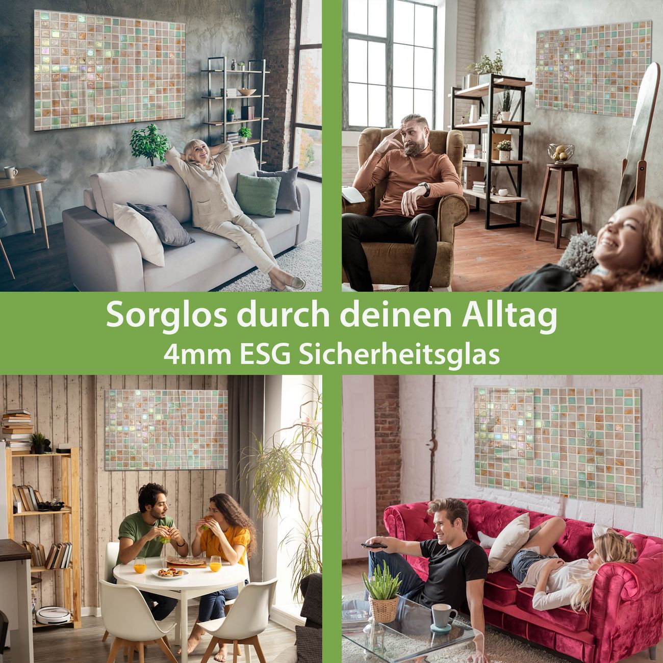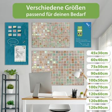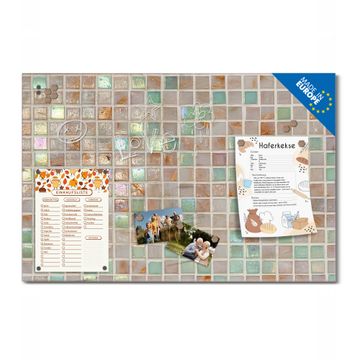 Material: 4mm Sicherheitsglas mit Metallrückwand Eigenschaften: beschreibbar, magnetisch, kratzfest Maße: 75x50x0,6cm, 5,63kg schwer Motiv Nummer 11375 Grüne Fliesen Zubehör: inklusive 4 Neodym-Magnete