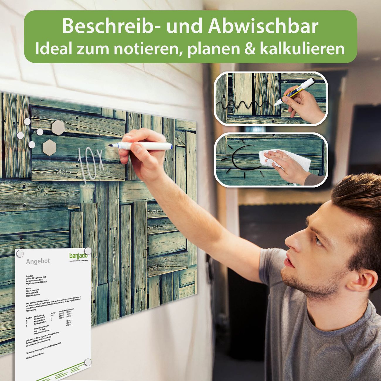 Material: 4mm Sicherheitsglas mit Metallrückwand Eigenschaften: beschreibbar, magnetisch, kratzfest Maße: 120x60x0,6cm, 10,80kg schwer Motiv Nummer 11929 Grüne Planken Zubehör: inklusive 4 Neodym-Magnete