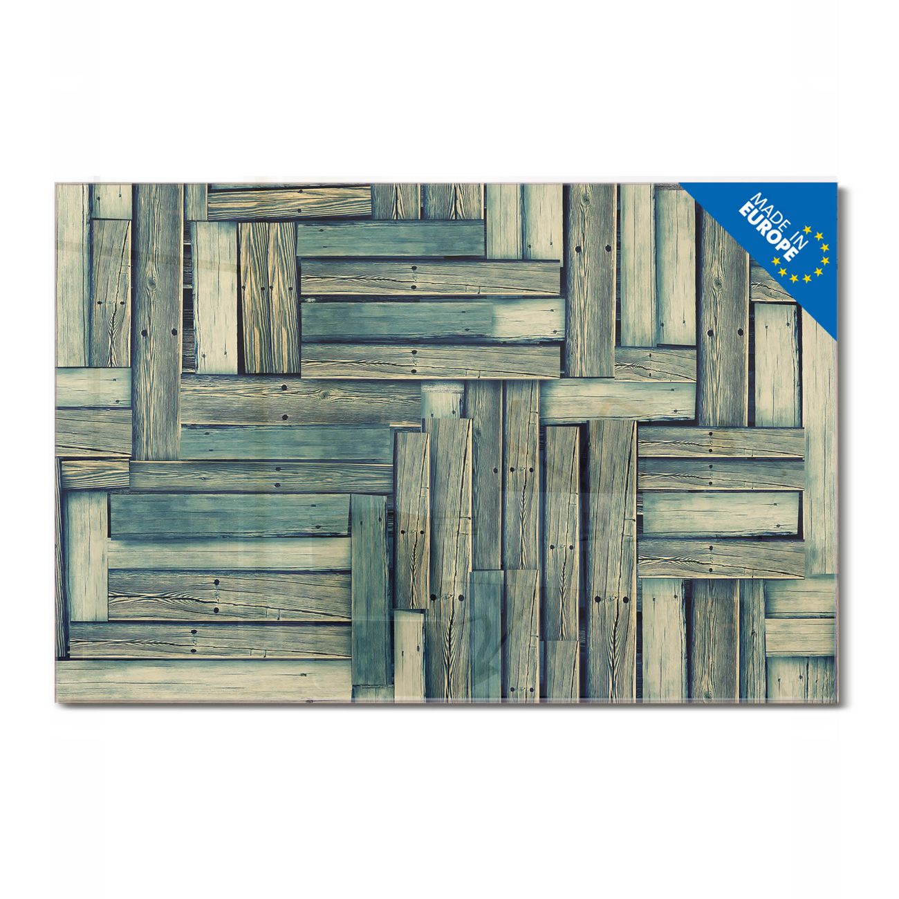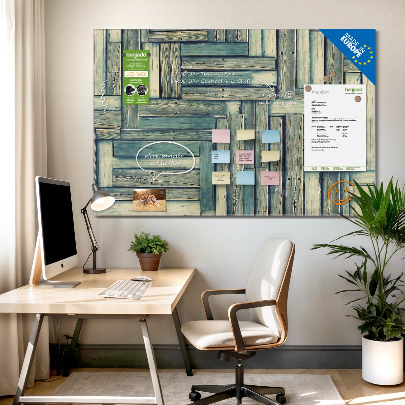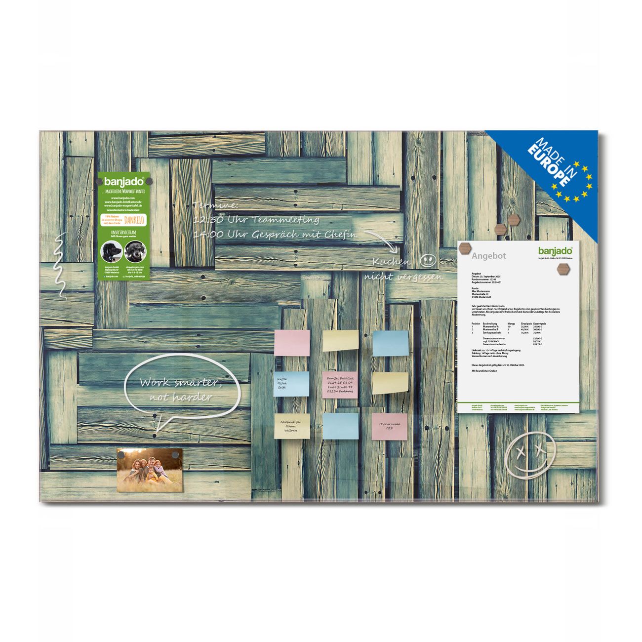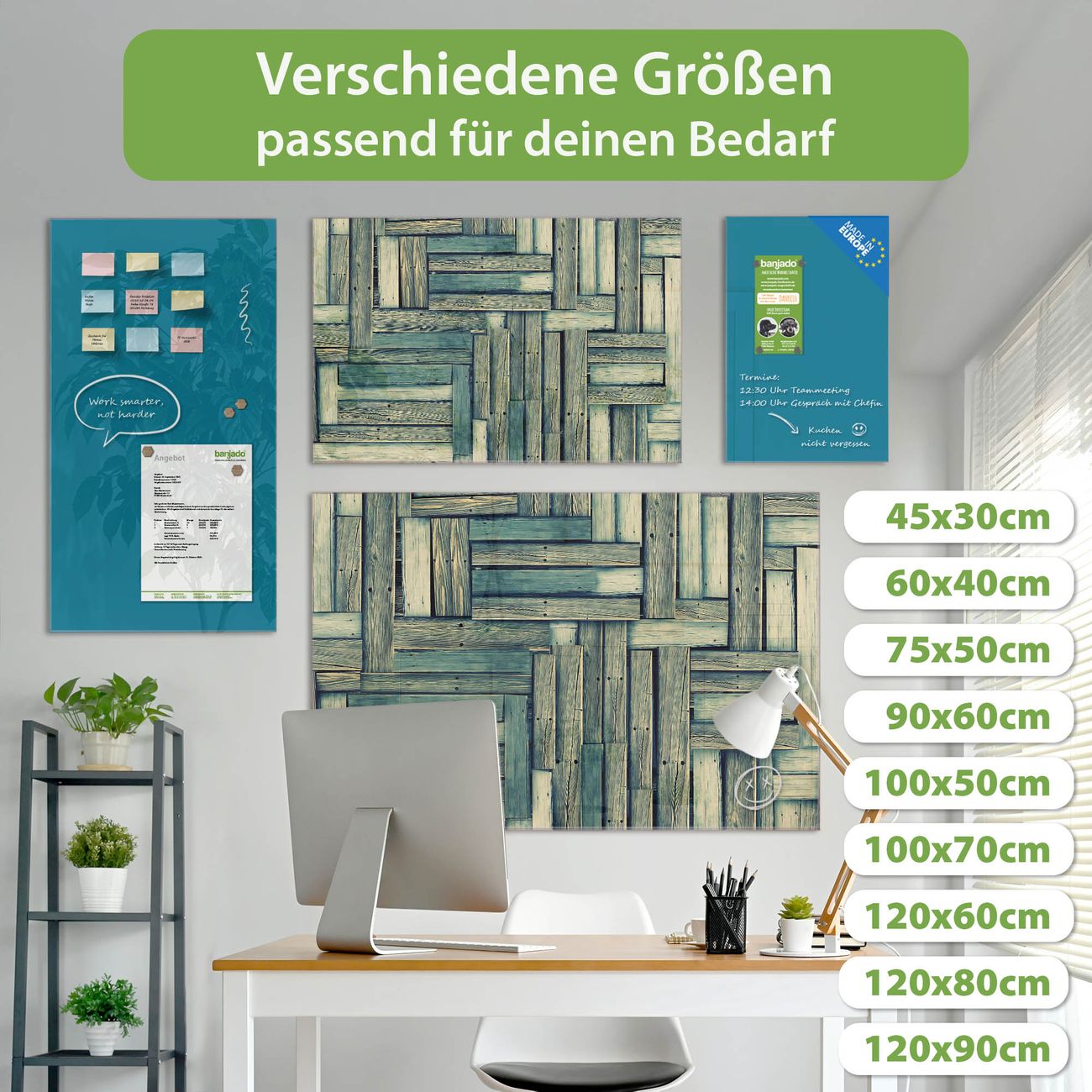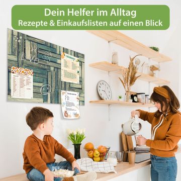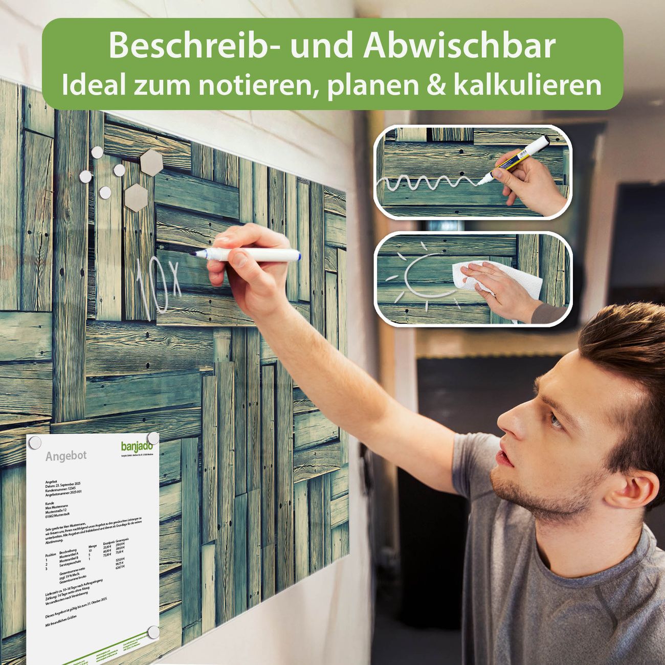 Material: 4mm Sicherheitsglas mit Metallrückwand Eigenschaften: beschreibbar, magnetisch, kratzfest Maße: 90x60x0,6cm, 8,10kg schwer Motiv Nummer 11929 Grüne Planken Zubehör: inklusive 4 Neodym-Magnete