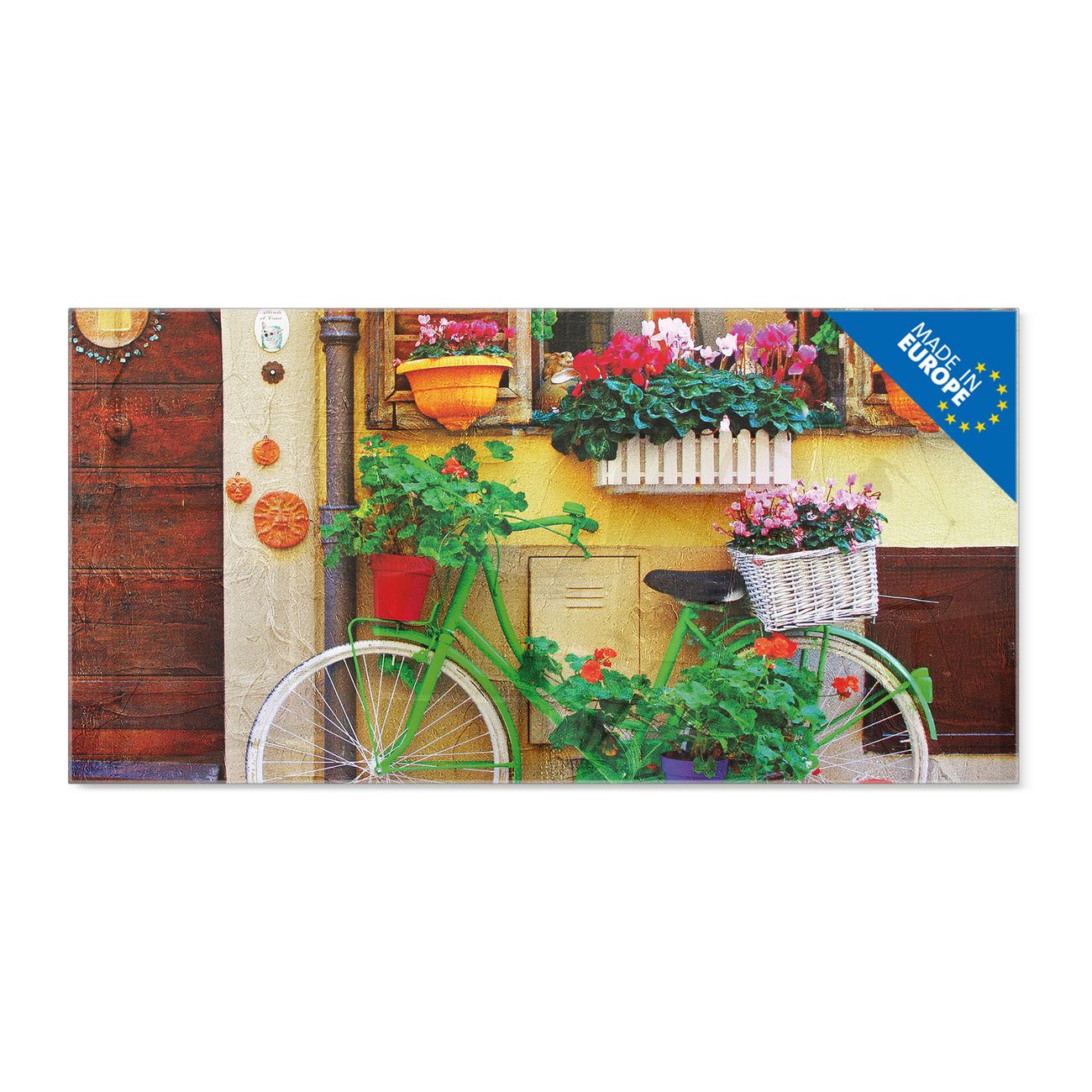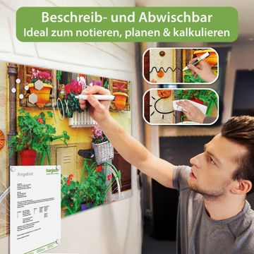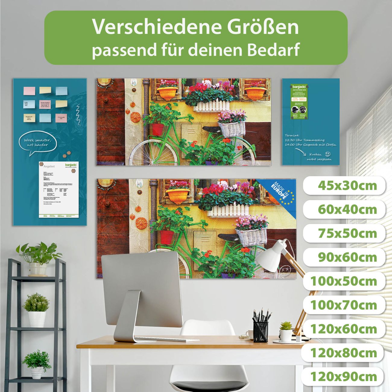 Material: 4mm Sicherheitsglas mit Metallrückwand Eigenschaften: beschreibbar, magnetisch, kratzfest Maße: 100x50x0,6cm, 7,50kg schwer Motiv Nummer 11107 Grünes Fahrrad Zubehör: inklusive 4 Neodym-Magnete