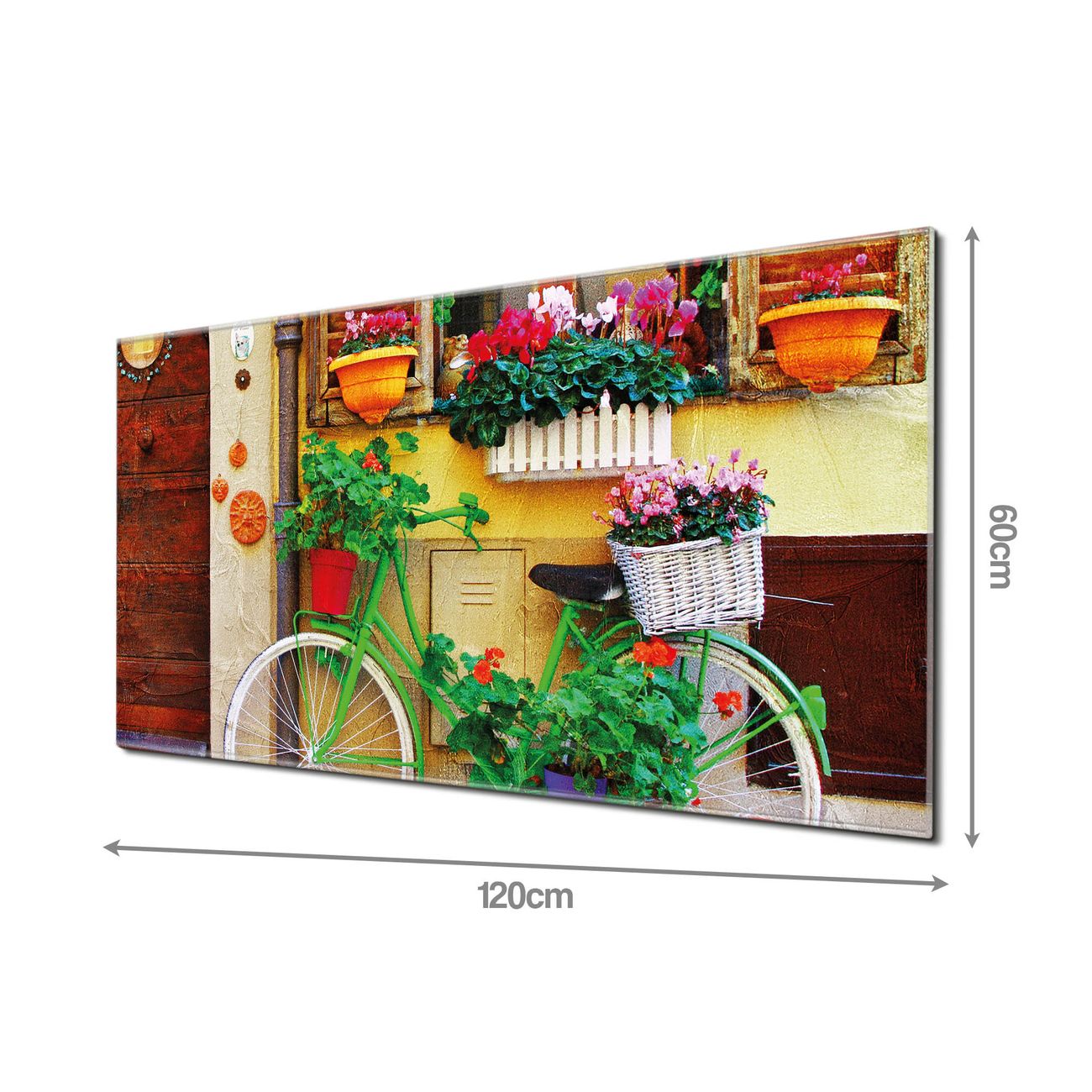 Material: 4mm Sicherheitsglas mit Metallrückwand Eigenschaften: beschreibbar, magnetisch, kratzfest Maße: 120x60x0,6cm, 10,80kg schwer Motiv Nummer 11107 Grünes Fahrrad Zubehör: inklusive 4 Neodym-Magnete