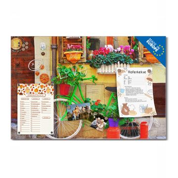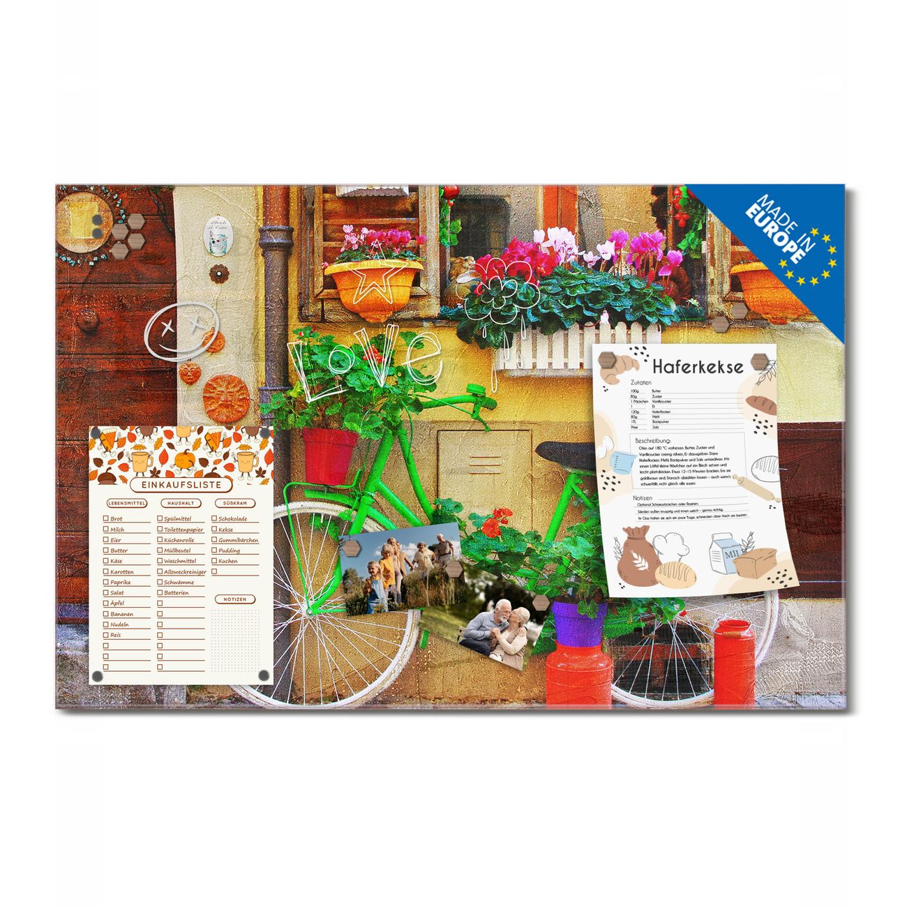 Material: 4mm Sicherheitsglas mit Metallrückwand Eigenschaften: beschreibbar, magnetisch, kratzfest Maße: 60x40x0,6cm, 3,6kg schwer Motiv Nummer 11107 Grünes Fahrrad Zubehör: inklusive 4 Neodym-Magnete