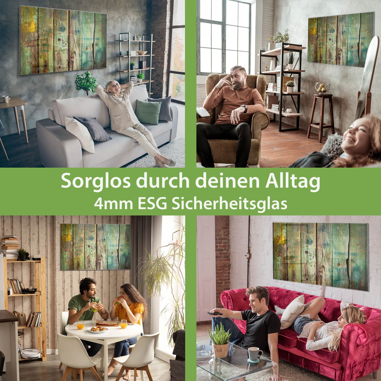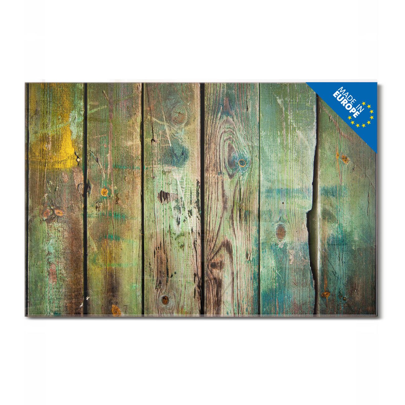 Material: 4mm Sicherheitsglas mit Metallrückwand Eigenschaften: beschreibbar, magnetisch, kratzfest Maße: 120x80x0,6cm, 14,40kg schwer Motiv Nummer 12157 Grünes Holz Zubehör: inklusive 4 Neodym-Magnete