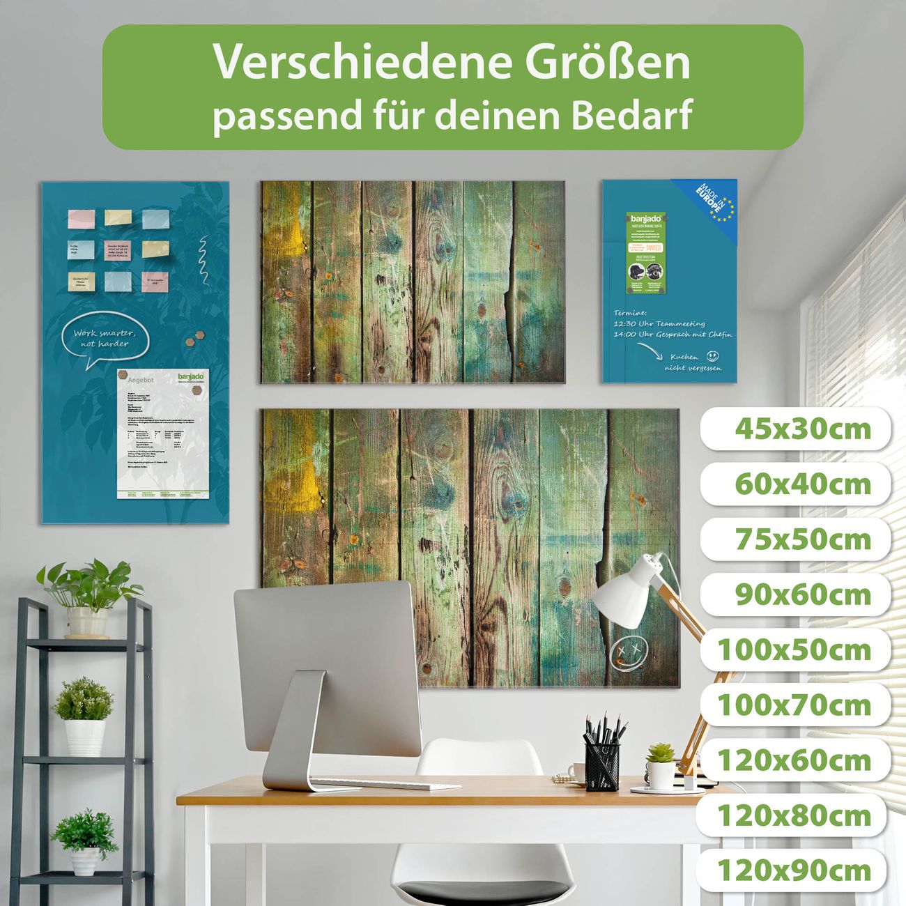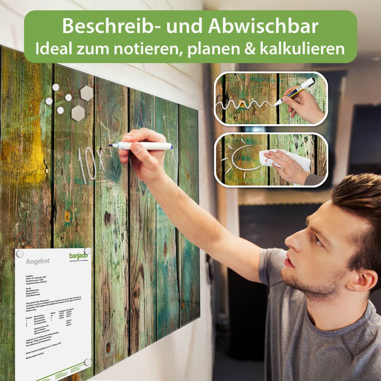 Jede Glas Magnettafel wird in unserer Werkstatt von Hand gefertigt und sorgfältig geprüft. So erhalten Sie ein echtes Qualitätsprodukt, das Funktion und Ästhetik perfekt vereint.?? Warum banjado?