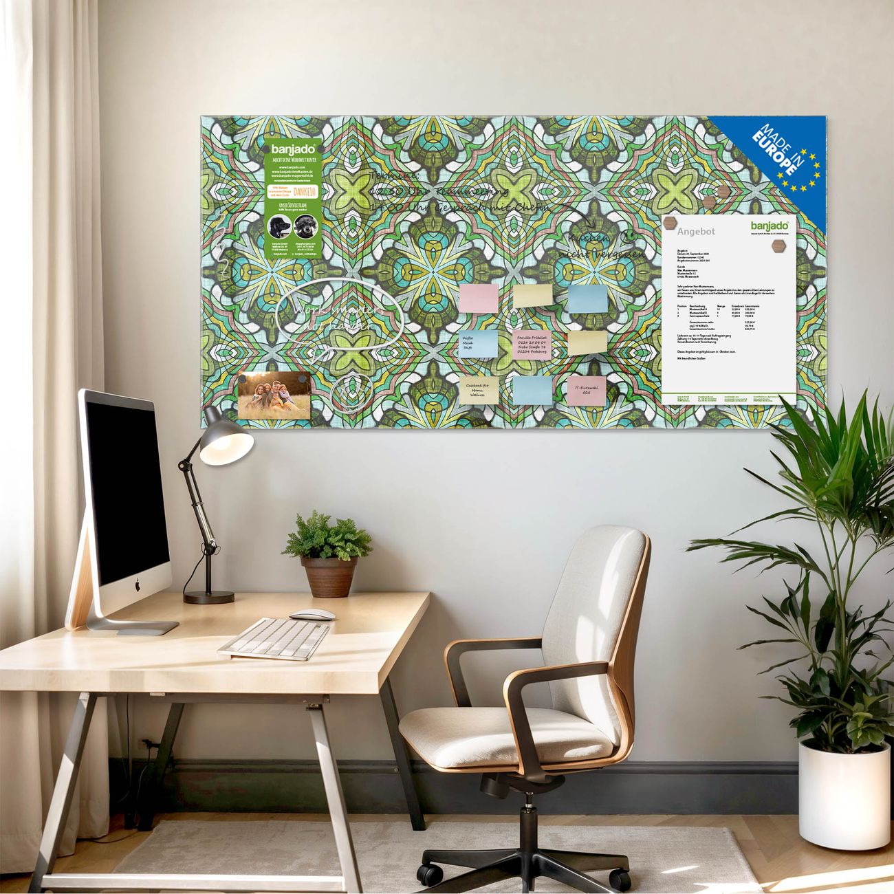 Die banjado Glas Magnettafel mit dem Motiv Motiv Grünes Muster verbindet Funktionalität mit Stil. Sie ersetzt das Zettelchaos durch klare Strukturen und bringt dabei eine warme, natürliche Atmosphäre in Ihr Zuhause. Ob im Büro, in der Küche oder im Eingangsbereich - dieses Design-Board zieht Blicke an und sorgt für Ordnung mit Charakter.