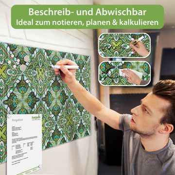 Material: 4mm Sicherheitsglas mit Metallrückwand Eigenschaften: beschreibbar, magnetisch, kratzfest Maße: 120x60x0,6cm, 10,80kg schwer Motiv Nummer 10796 Grünes Muster Zubehör: inklusive 4 Neodym-Magnete