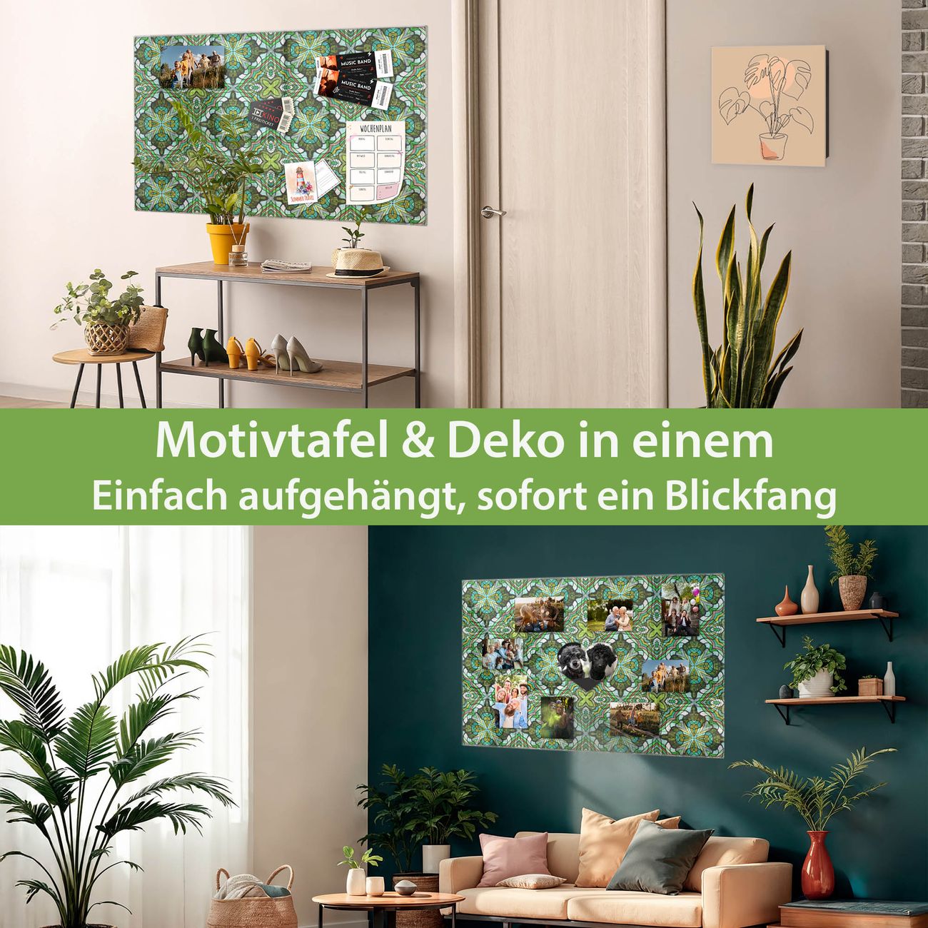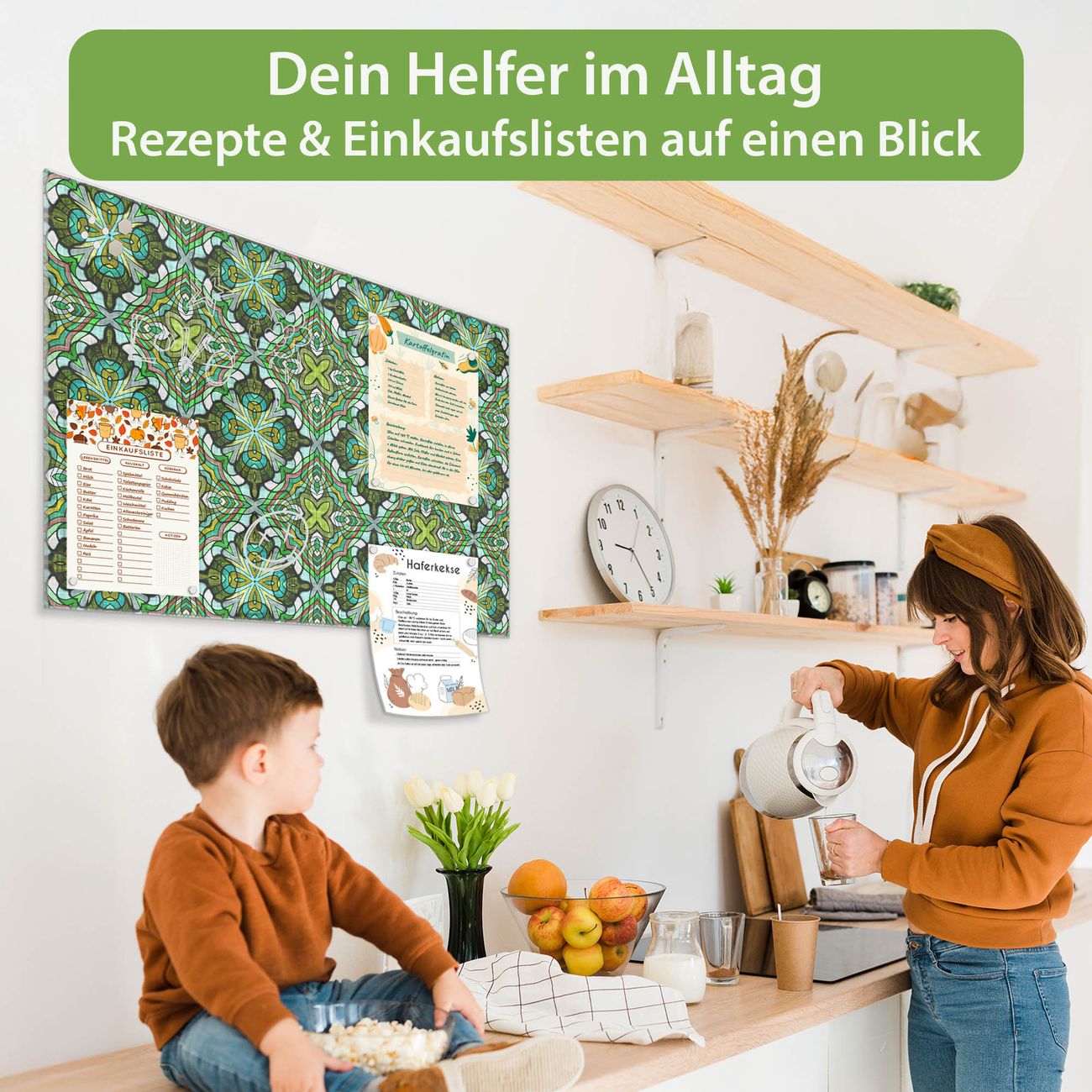 Ein Stück Design, das Ihren Alltag organisiert. Schreiben, heften, inspirieren - alles an einem Ort. Qualität, die man spürt. Montage leicht gemacht. Handwerk mit Herz - veredelt in Sachsen. Einzigartiges Design mit Motiv Motiv Grünes Muster Beschreibbare Glasoberfläche, leicht zu reinigen Starke Magnetkraft durch Stahlrückwand Inklusive 4 Neodym-Magneten Flexible Montageoptionen Handveredelt in Sachsen - Qualität, die bleibt