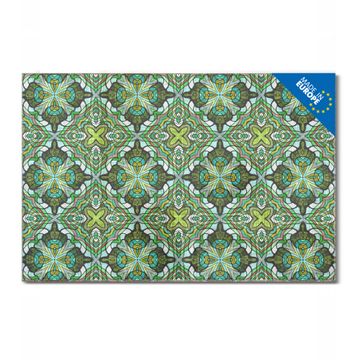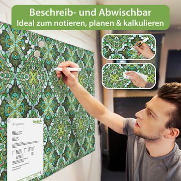 Material: 4mm Sicherheitsglas mit Metallrückwand Eigenschaften: beschreibbar, magnetisch, kratzfest Maße: 75x50x0,6cm, 5,63kg schwer Motiv Nummer 10796 Grünes Muster Zubehör: inklusive 4 Neodym-Magnete
