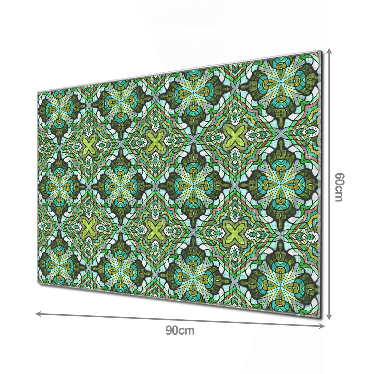 Material: 4mm Sicherheitsglas mit Metallrückwand Eigenschaften: beschreibbar, magnetisch, kratzfest Maße: 90x60x0,6cm, 8,10kg schwer Motiv Nummer 10796 Grünes Muster Zubehör: inklusive 4 Neodym-Magnete