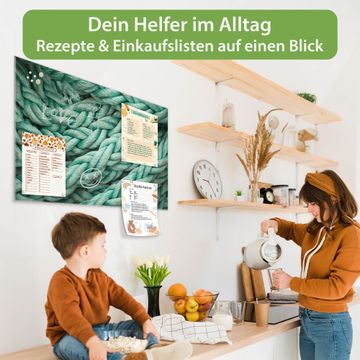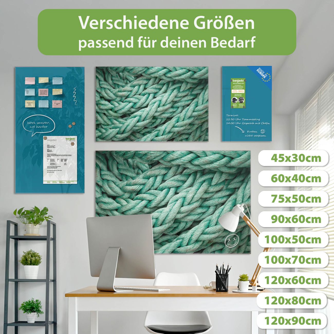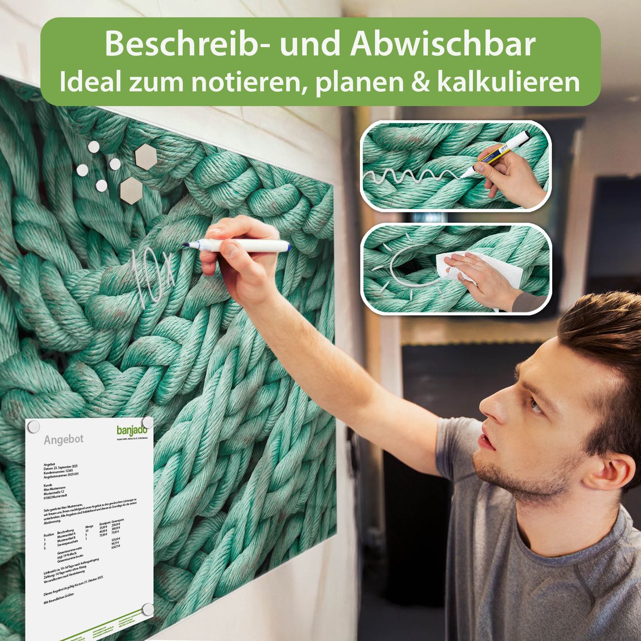 Material: 4mm Sicherheitsglas mit Metallrückwand Eigenschaften: beschreibbar, magnetisch, kratzfest Maße: 45x30x0,6cm, 2,03kg schwer Motiv Nummer 11945 Grünes Tau Zubehör: inklusive 4 Neodym-Magnete