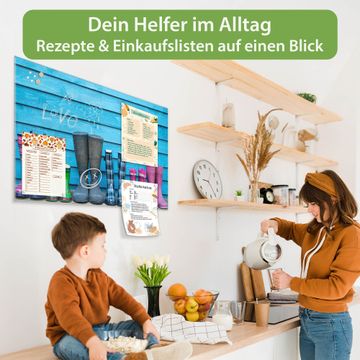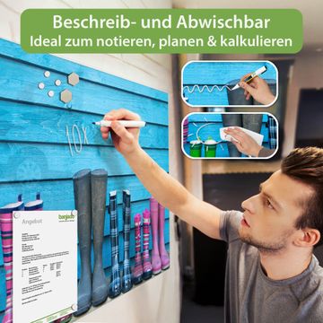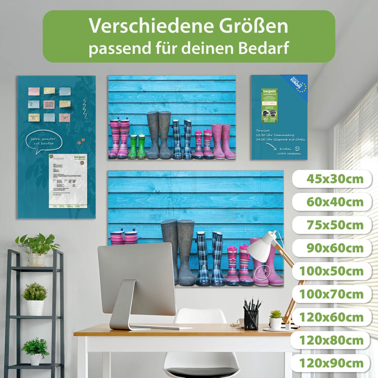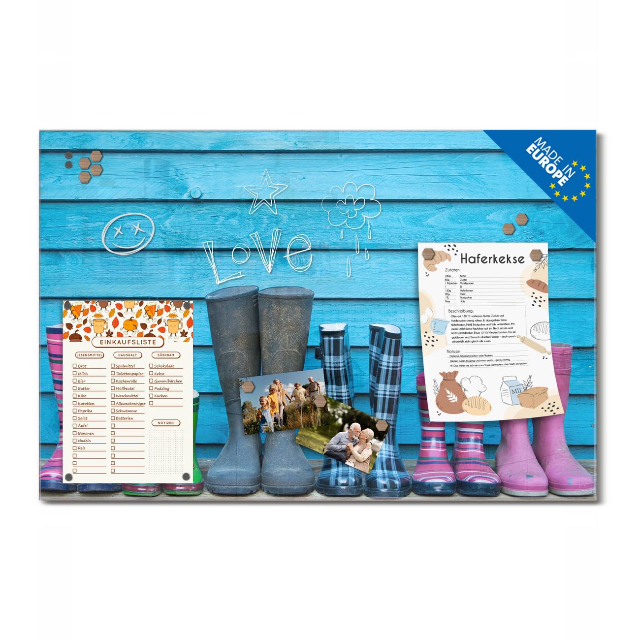 Material: 4mm Sicherheitsglas mit Metallrückwand Eigenschaften: beschreibbar, magnetisch, kratzfest Maße: 120x60x0,6cm, 10,80kg schwer Motiv Nummer 10359 Gummistiefel Zubehör: inklusive 4 Neodym-Magnete