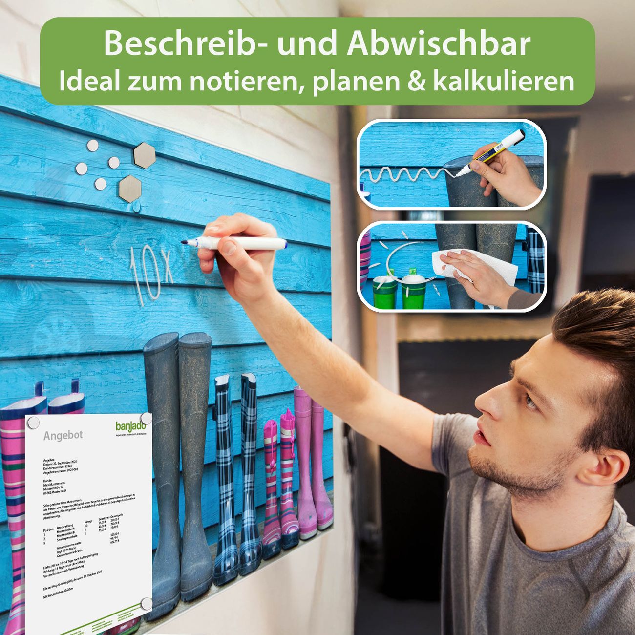 Bitte beachten Sie, dass ausschliessliche spezielle Magnete an der Glastafel haften. Wir empfehlen banjado Neodym Magnete, diese sind durch uns auf Wirksamkeit geprüft.