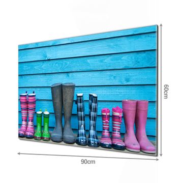 Material: 4mm Sicherheitsglas mit Metallrückwand Eigenschaften: beschreibbar, magnetisch, kratzfest Maße: 90x60x0,6cm, 8,10kg schwer Motiv Nummer 10359 Gummistiefel Zubehör: inklusive 4 Neodym-Magnete